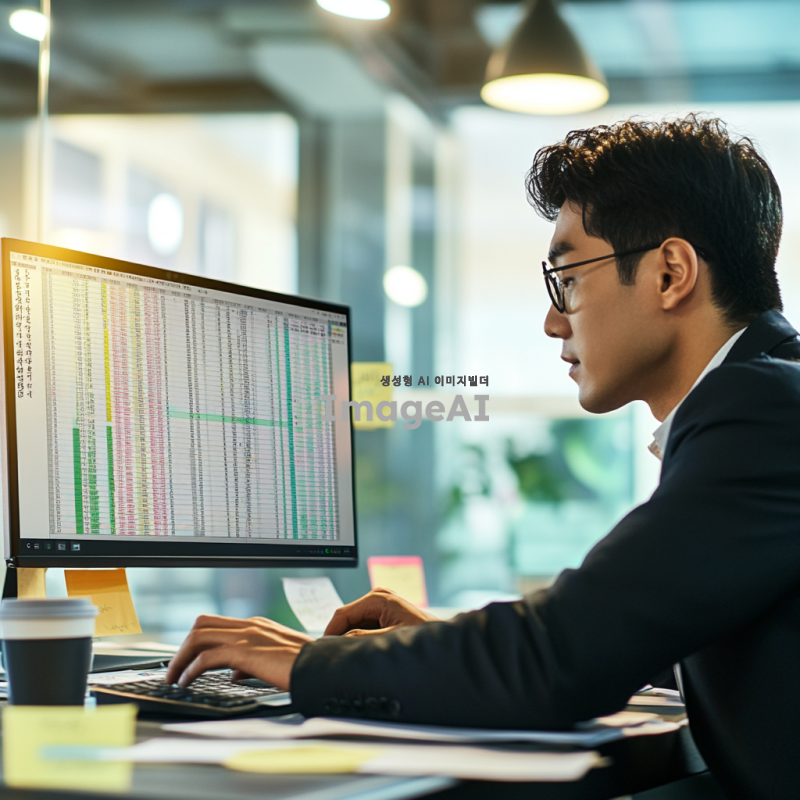 한국의 사무실 환경에서 엑셀 단축키를 사용하여 작업하는 한국인 직장인의 모습을 그려주세요. 배경에는 컴퓨터 화면이 보이고, 엑셀 프로그램의 인터페이스가 잘 보이도록 해주세요. 직장인은 집중한 표정으로 키보드를 누르고 있으며, 주변에는 메모지와 커피 컵이 놓여 있습니다. 조명은 밝고 현대적인 사무실 분위기를 연출해 주세요.