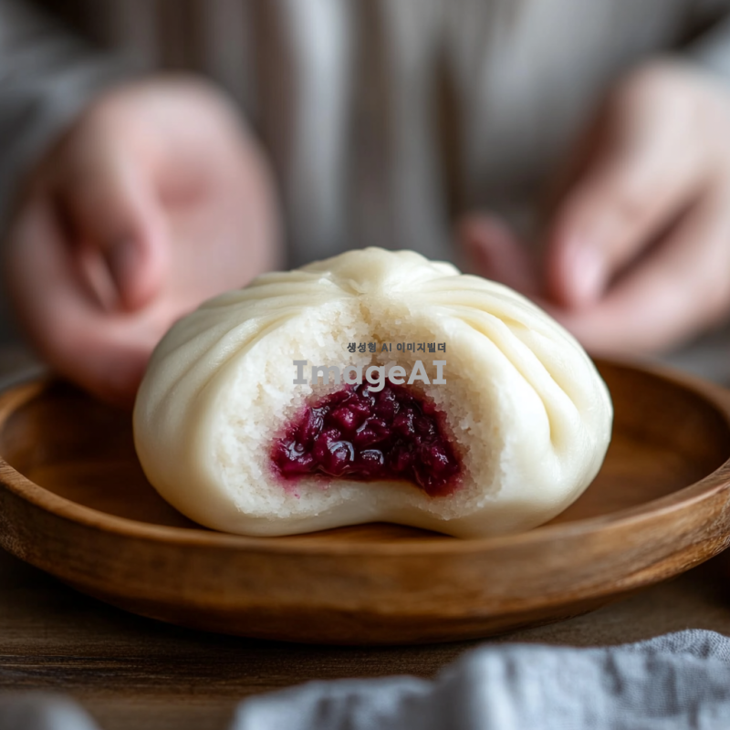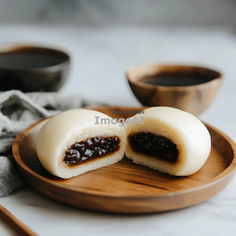 부드럽고 따뜻한 찐빵이 나무 접시에 놓여 있는 모습 반 갈라서 팥도 보이고