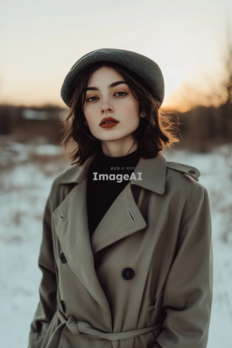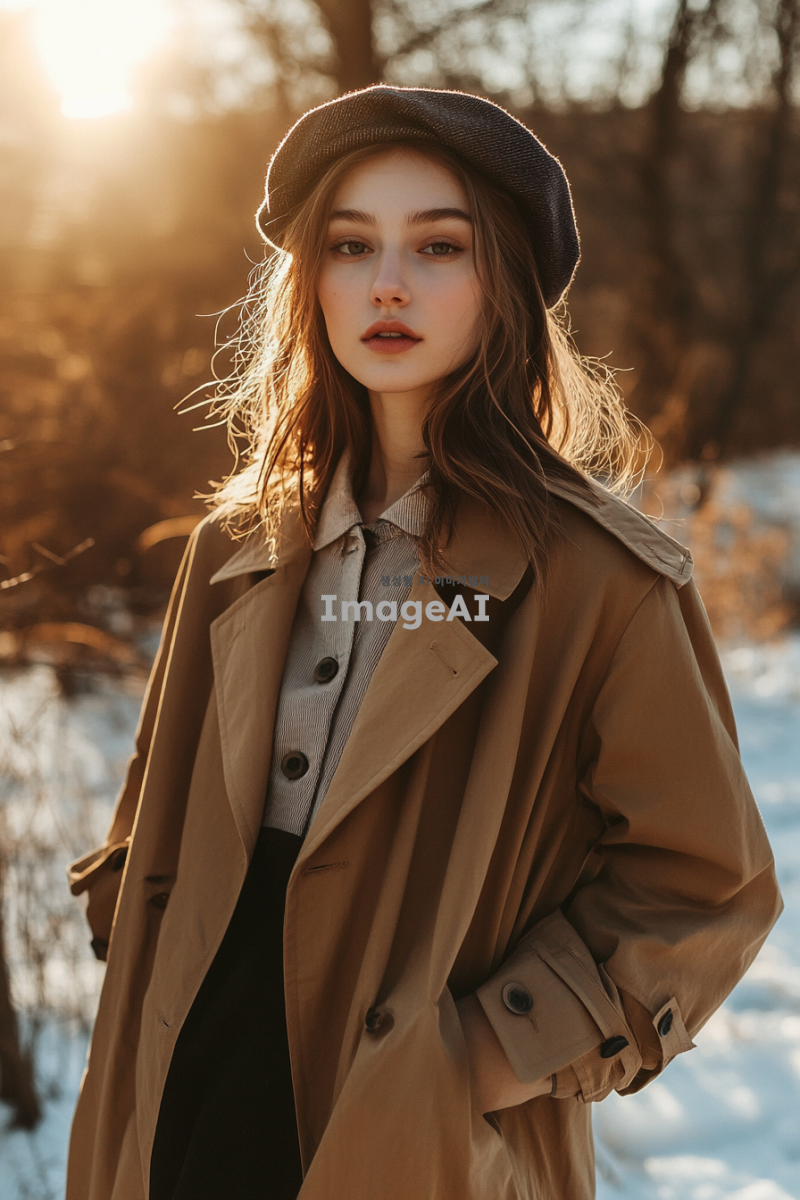트랜치 코트를 입고 정모를 쓴 여성의 전신 모습, 부드러운 조명 아래에서 자연스럽게 서 있는 자세, 배경은 겨울 풍경으로, 따뜻한 느낌을 주는 색감으로, 우아하고 세련된 스타일을 강조하며, 여성의 표정은 편안하고 자신감 있는 모습으로 표현.
