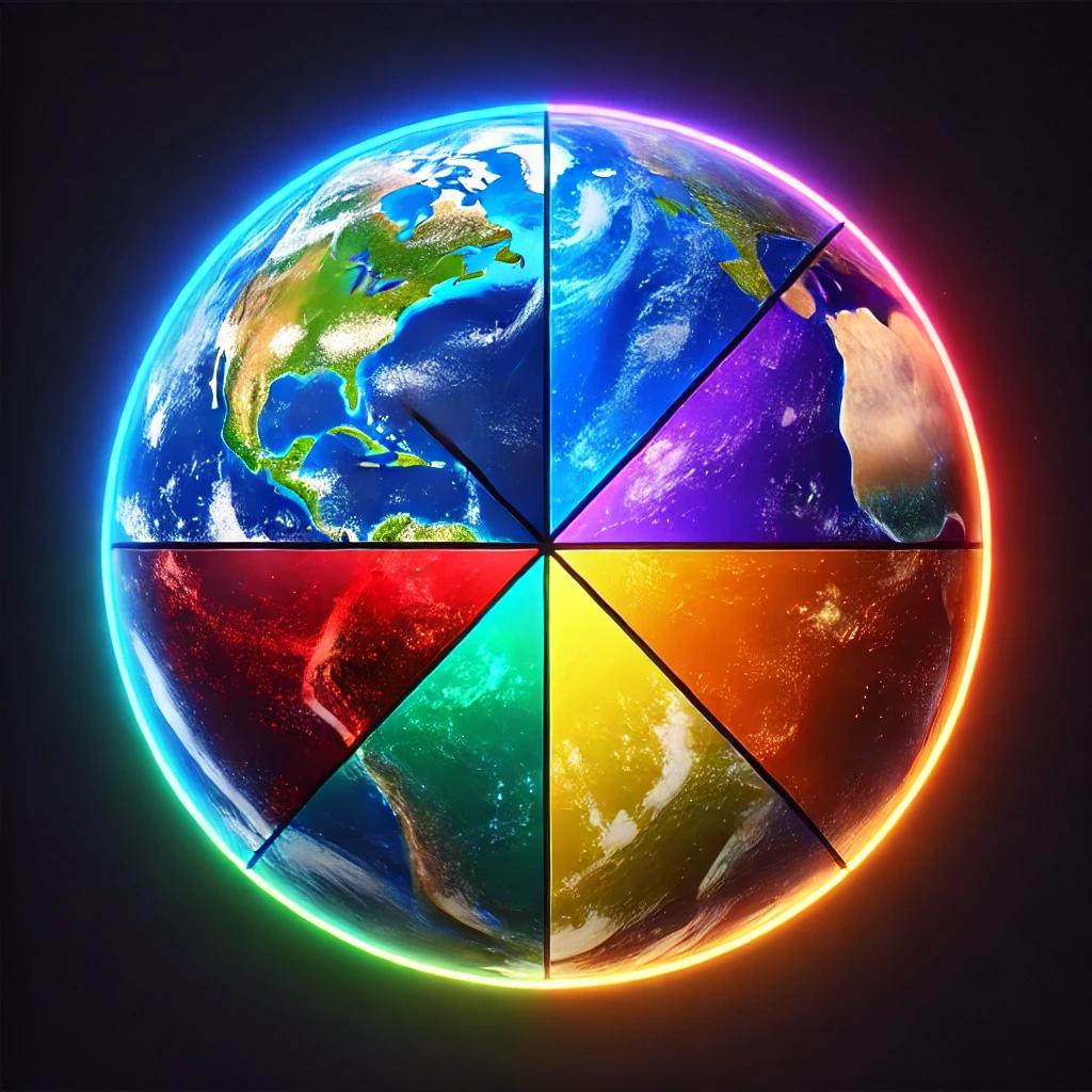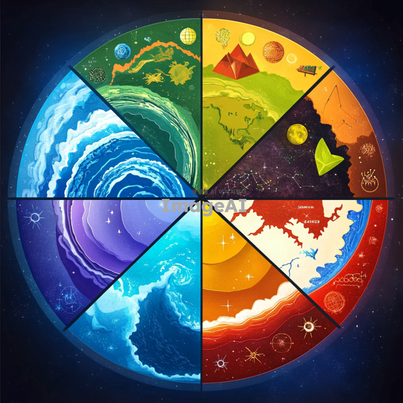 원형 모양에서 6개의 동등하고 대칭적인 모양으로 섹션을 나눈다. 각 섹션은 독특한 색상, 텍스처 및 주제 그래픽 요소를 가진 다른 과학 분야를 나타냅니다. 각 섹션은 고유 한 테마와 색상 팔레트를 유지하면서 인접 섹션에 부드럽게 혼합되어야합니다