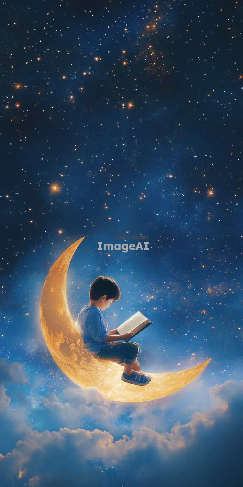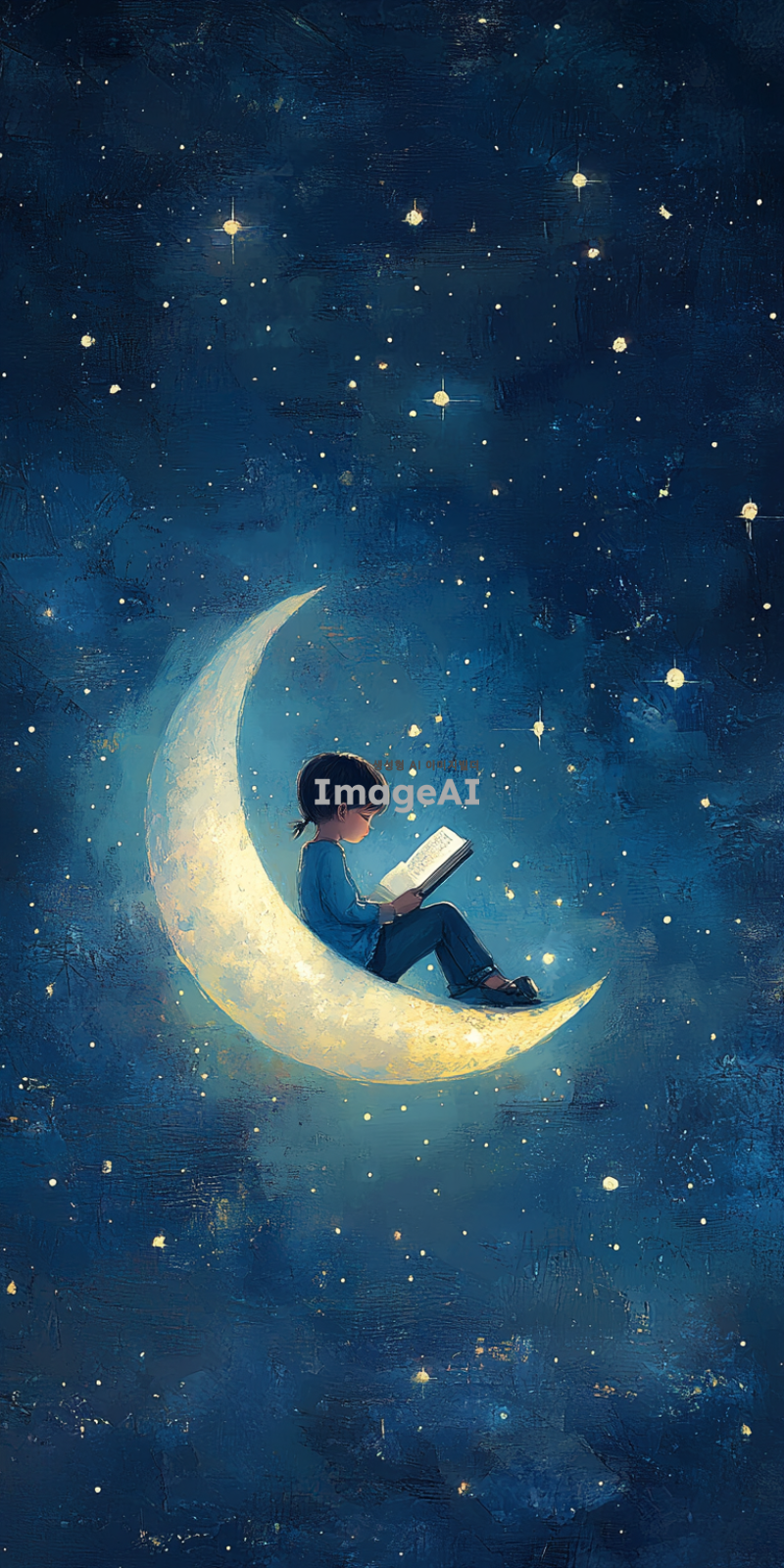 초승달 위에 앉아 책을 읽고 있는 한국인 아이의 모습, 부드러운 달빛이 아이를 비추고 있는 장면, 고요한 밤하늘과 별들이 반짝이는 배경, 아이의 표정은 집중하고 있는 모습, 세로형 구성