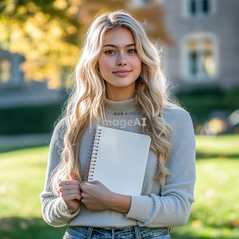 캠퍼스 잔디밭에서 흰색 그램 노트북을 들고 있는 여리여리한 금발여대생