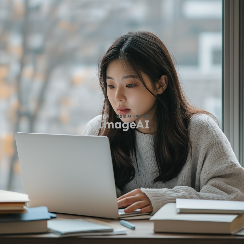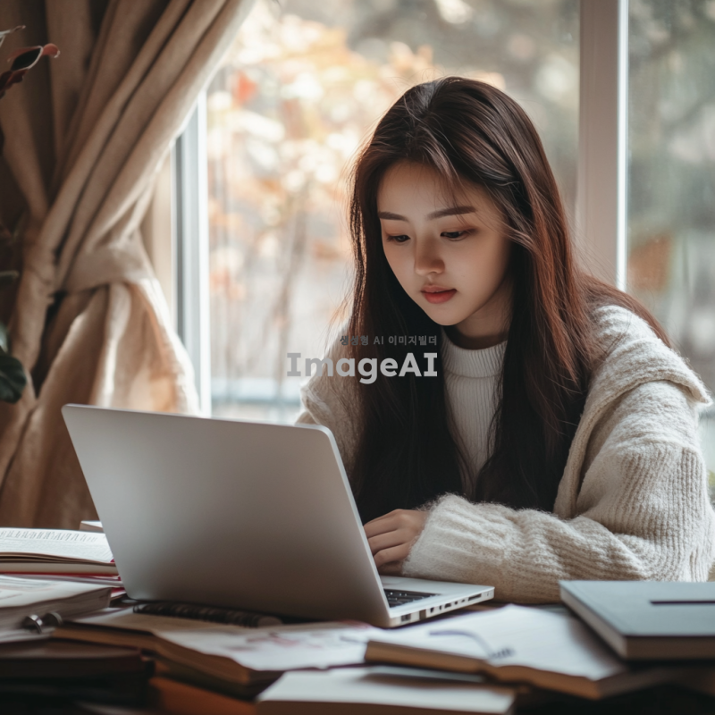 흰색 노트북 앞에 앉아 열심히 공부하는 한국 여대생, 책과 노트가 주변에 흩어져 있고 집중하는 표정, 자연광이 들어오는 창가에서 학습하는 모습, 편안한 옷차림, 차분한 분위기