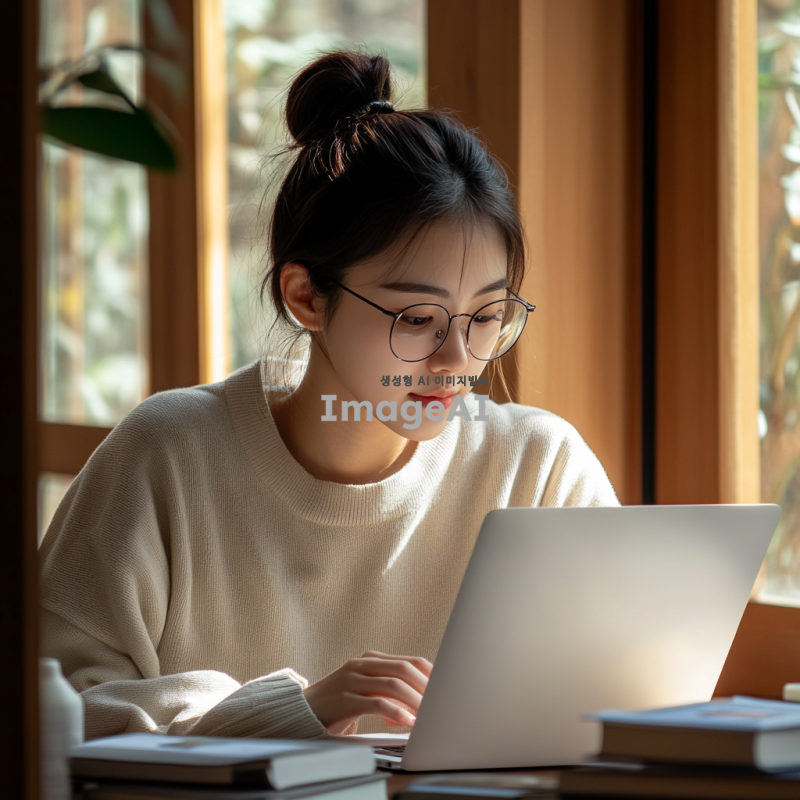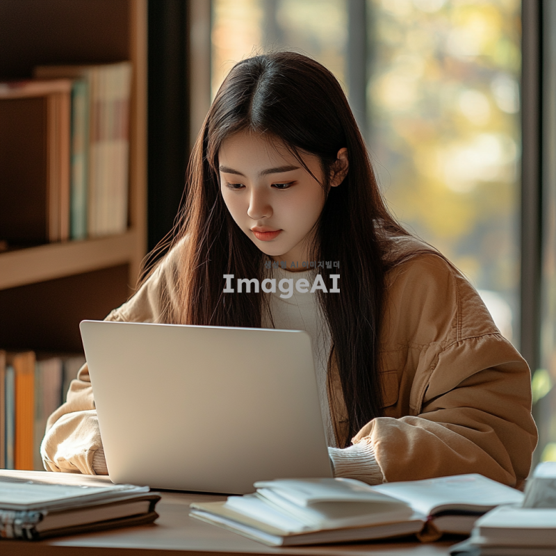 각진 모서리의 흰색 노트북을 사용하여 공부하는 한국 여대생, 조용한 도서관에서 집중하는 모습, 책과 노트가 주변에 놓여 있고, 자연광이 들어오는 창가에 앉아 있는 장면, 편안한 캐주얼 의상을 입고 있는 모습.