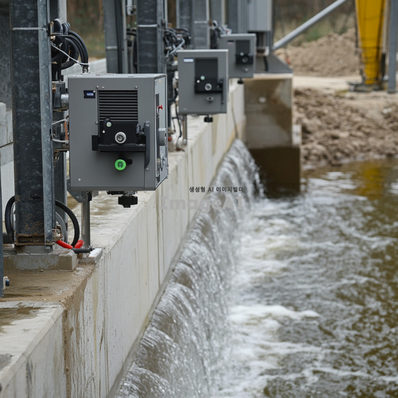 초음파 수위계가 설치된 가동보의 세부적인 기계 장치와 센서의 디테일 강조,