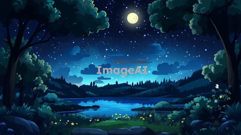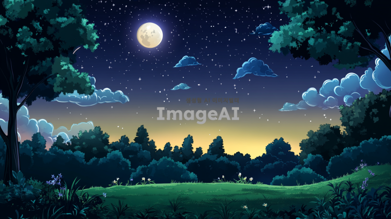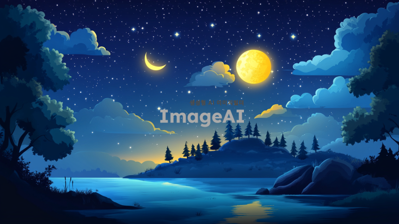 별들이 반짝이는 아름다운 밤하늘, 달빛이 비추는 고요한 풍경, 섬에 숲과 함께 어우러진 자연 속의 밤하늘,