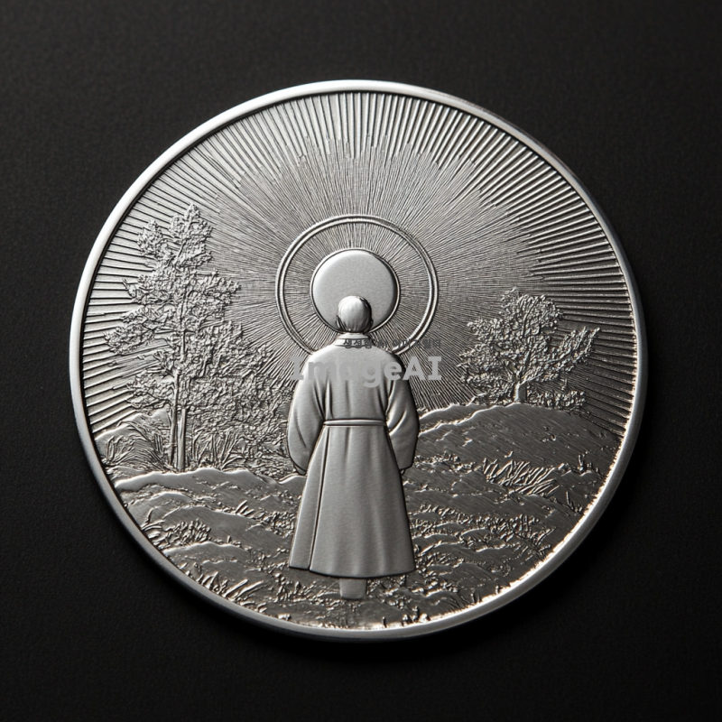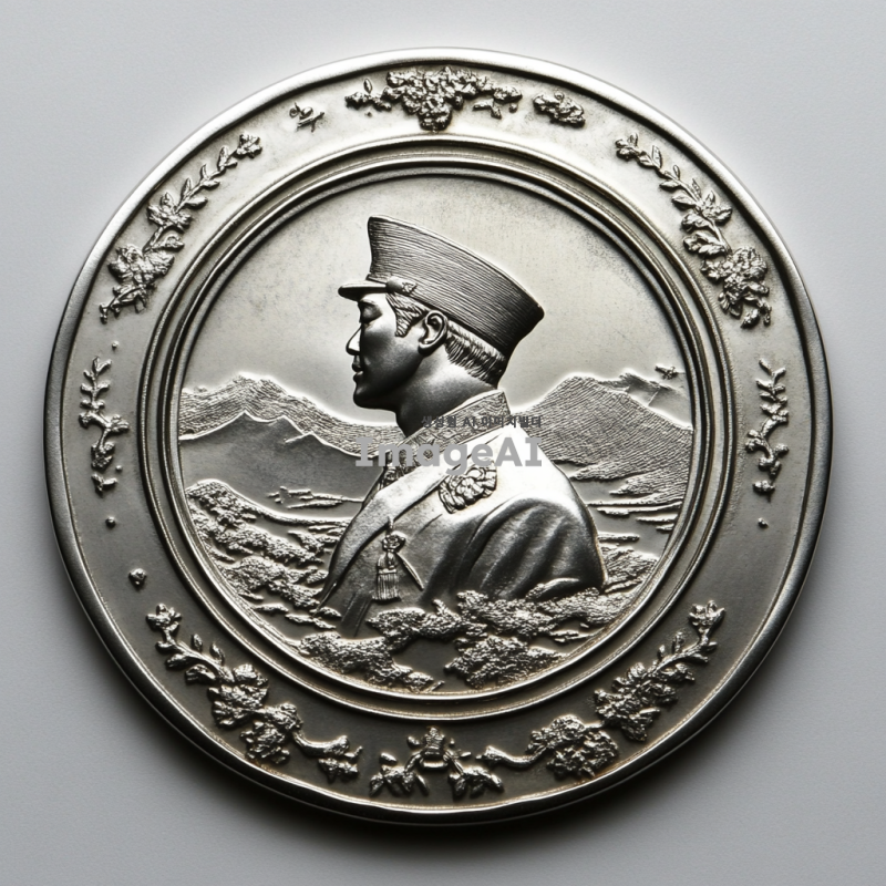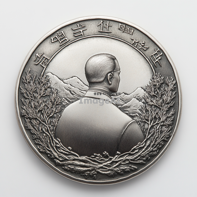 한국의 광복을 기념하는 은메달 디자인, 중앙에 태극기와 독립운동가의 실루엣을 적용
