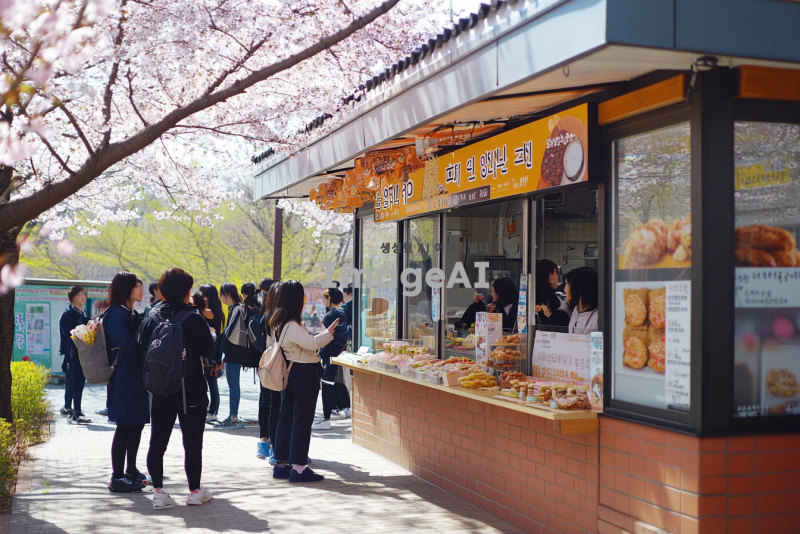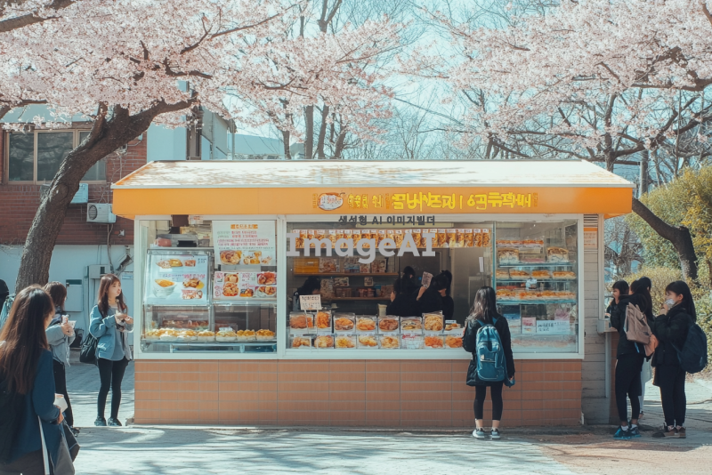 여고 앞 분식집 풍경, 다양한 분식 메뉴가 진열된 가게 외관, 학생들이 모여 앉아 수다를 나누고 있는 모습, 따뜻한 조명 아래에서 즐거운 분위기, 한국 전통 분식인 떡볶이, 순대, 김밥 등이 보이는 장면, 아기자기한 인테리어와 소품들, 봄날의 화창한 날씨, 주변에 벚꽃이 피어 있는 모습, 학생들의 유니폼이 잘 보이도록.