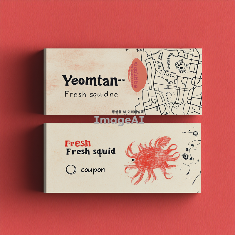 명함 두개 크기의 쿠폰을 만들거야 겉 면에는 연탄해 라는 글씨와 함께 로고가 써있고 안에 내용은 생오징어 한 마리 쿠폰이라고 써있고 한 쪽면에 약도가 그려져 있어. 배경색은 빨간색이었으면 좋겠어