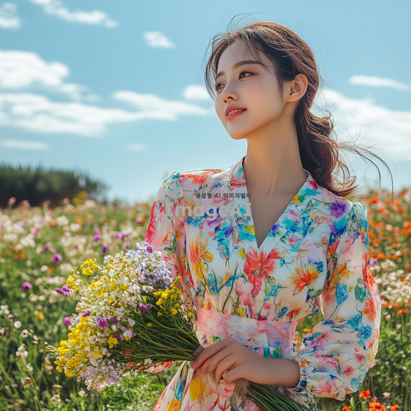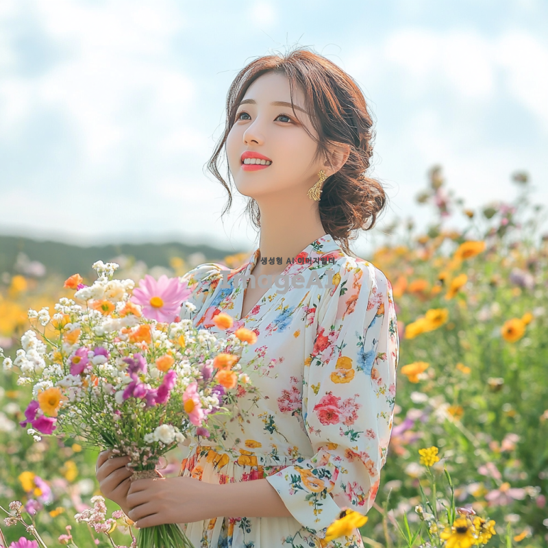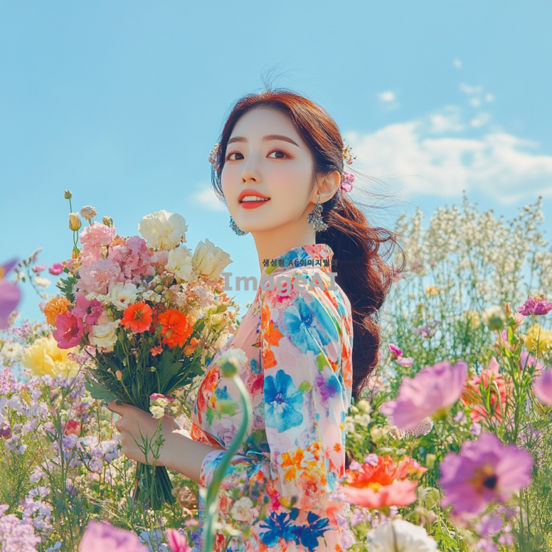봄날의 화창한 날씨 속에서 아름다운 꽃들 사이에 서 있는 한국인 여성의 모습. 그녀는 화사한 꽃무늬 드레스를 입고 있으며, 손에는 화려한 꽃다발을 들고 있다. 배경에는 만개한 꽃밭과 푸른 하늘이 펼쳐져 있고, 여성의 얼굴에는 행복한 미소가 가득하다. 이 장면은 봄의 생동감과 아름다움을 강조하며, 여성의 우아함과 자연의 조화를 표현한다. 또한, 주변에 금전적인 상징을 연상시키는 소품들이 subtly 배치되어 있어, 봄과 함께하는 풍요로움을 암시한다.