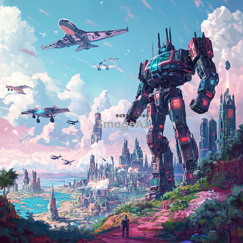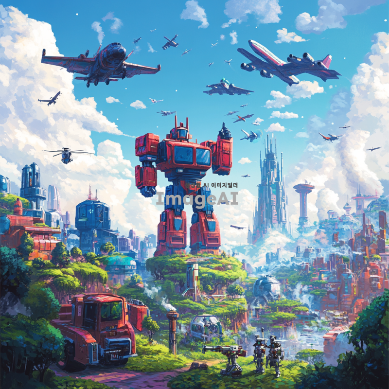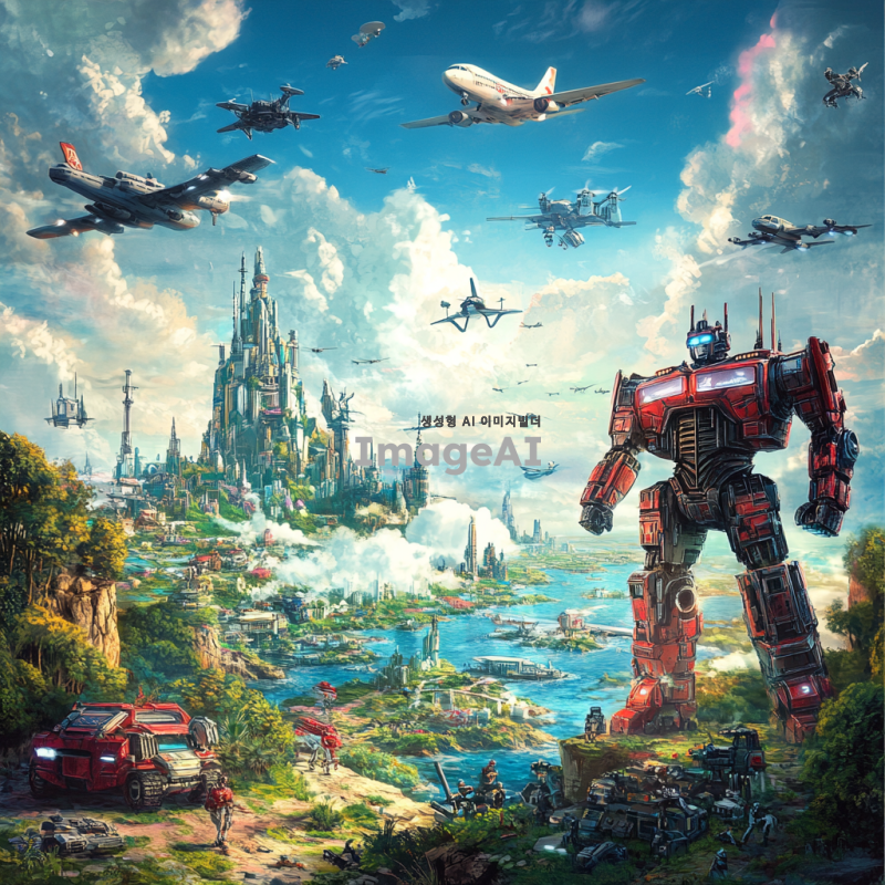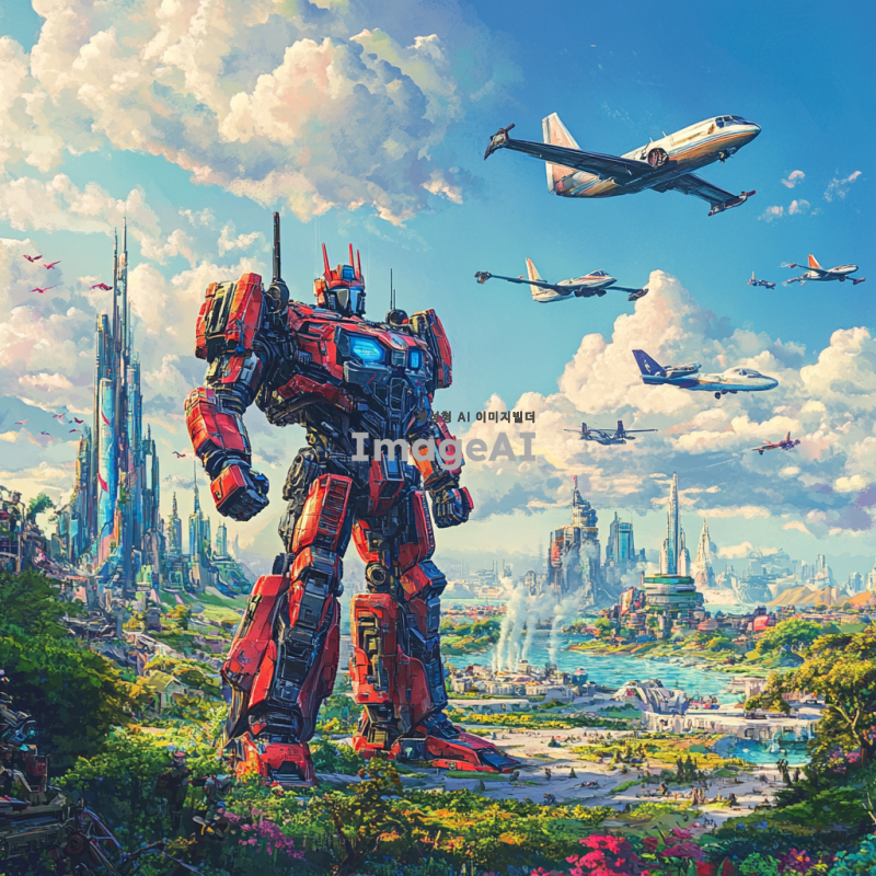 로봇, 드론, 옵티머스 프라임, 비행기가 존재하는 미래의 행성을 배경으로 한 장면. 다양한 형태의 로봇들이 협력하며 작업하고 있고, 하늘에서는 드론이 날아다니고 있으며, 옵티머스 프라임이 위엄 있게 서 있는 모습. 멀리 비행기가 떠 있는 모습도 보이고, 행성의 독특한 풍경과 구조물들이 어우러진 모습. 전체적으로 미래적이고 화려한 색감으로 표현된 장면.