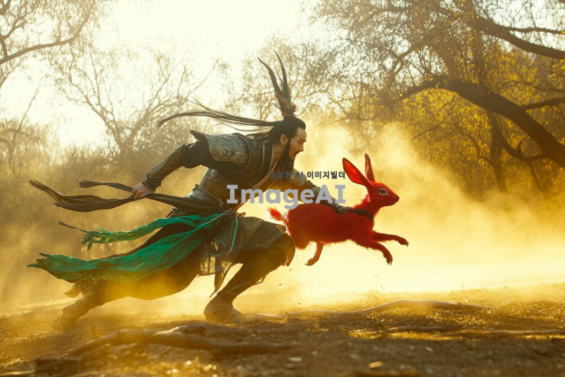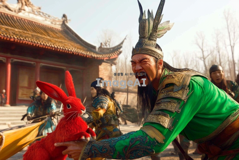 조조에게 적토마를 선물받은 관우, 근엄한 표정을 지으며 감정을 숨기고 있지만 내면에서는 뛰듯이 기쁜 모습, 전통적인 중국 복장을 입고, 배경은 고풍스러운 중국의 전쟁터, 따뜻한 햇살 아래에서 감정이 교차하는 순간을 포착한 장면.