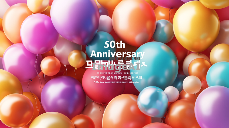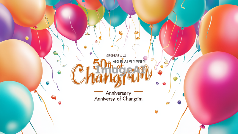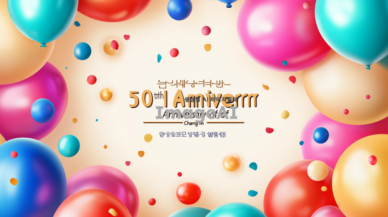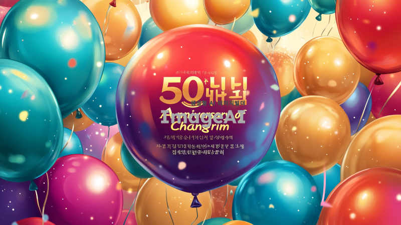 풍선 일러스트 위에 "창림 50주년"이라는 글씨가 새겨진 디자인, 다채로운 색상의 풍선들이 배경을 이루고 있는 장면, 축제 분위기를 강조하는 밝고 경쾌한 느낌, 한국적인 요소가 가미된 스타일, 글씨는 큼지막하고 읽기 쉽게, 전체적으로 기념일을 축하하는 즐거운 분위기.