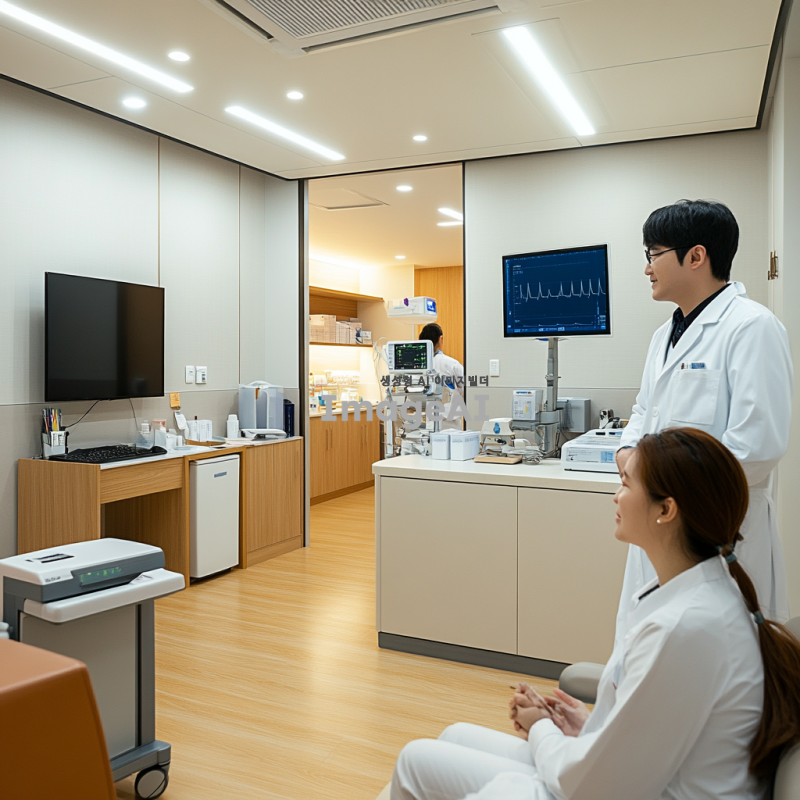 병원 내부의 현대적인 의료 환경, 환자와 의사가 소통하는 모습, 첨단 의료기기들이 배치된 진료실, 깨끗하고 안전한 분위기, 다양한 의료 장비가 조화롭게 어우러진 모습, 한국인 의사와 환자가 대화하는 장면, 따뜻한 조명이 비추는 병원 공간.