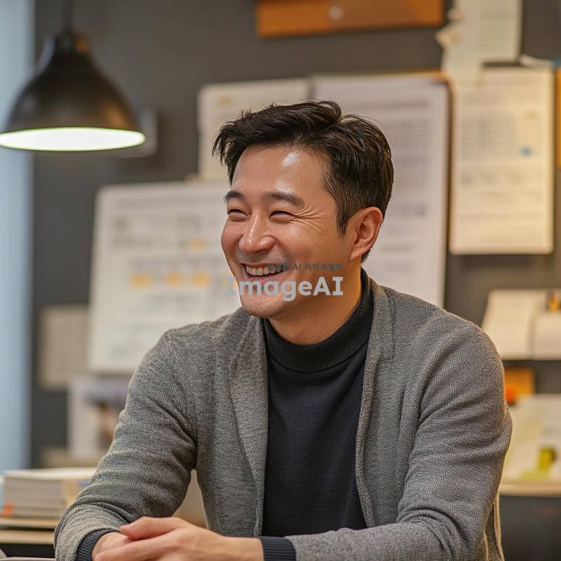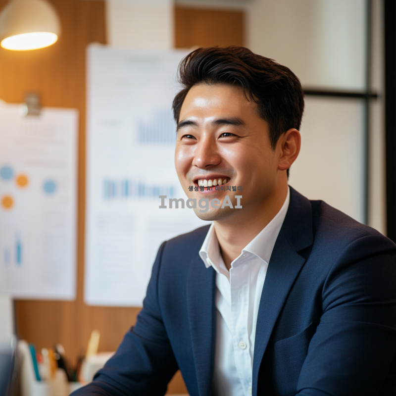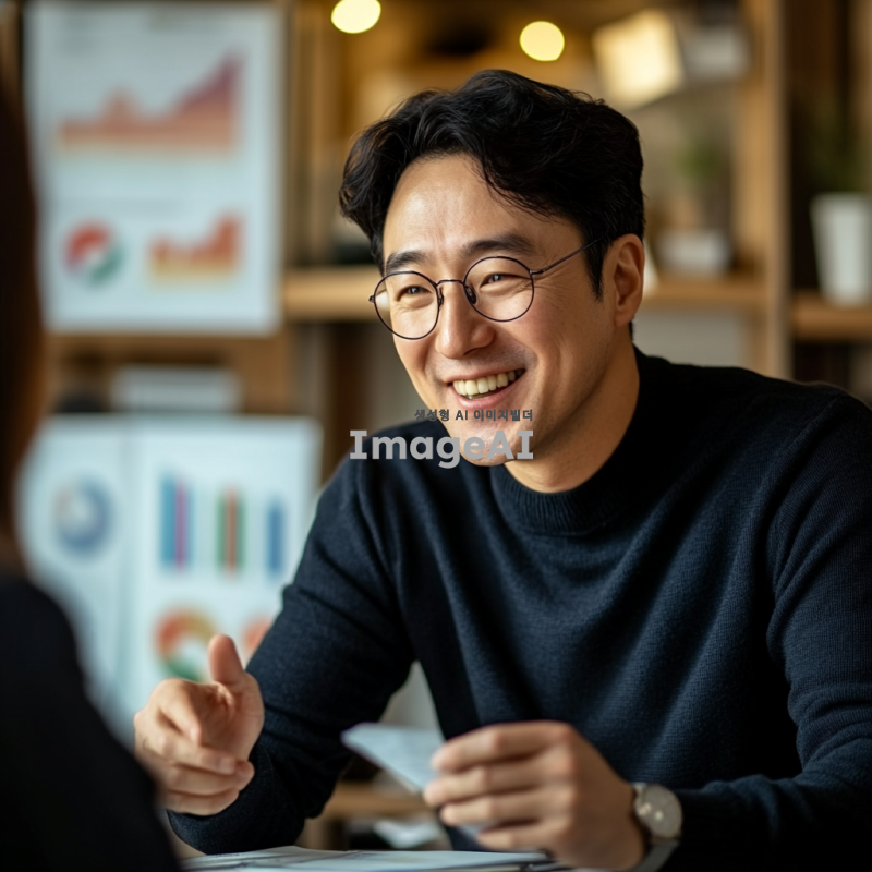 친근한 분위기의 부동산 창업 컨설턴트를 그려주세요. 한국인 남성이며, 밝은 미소를 지으며 고객과 대화하는 모습입니다. 사무실 배경에는 부동산 관련 자료와 차트가 보이고, 따뜻한 색조의 조명이 감도는 아늑한 공간입니다. 고객과의 신뢰를 구축하는 모습이 강조되도록 해주세요.