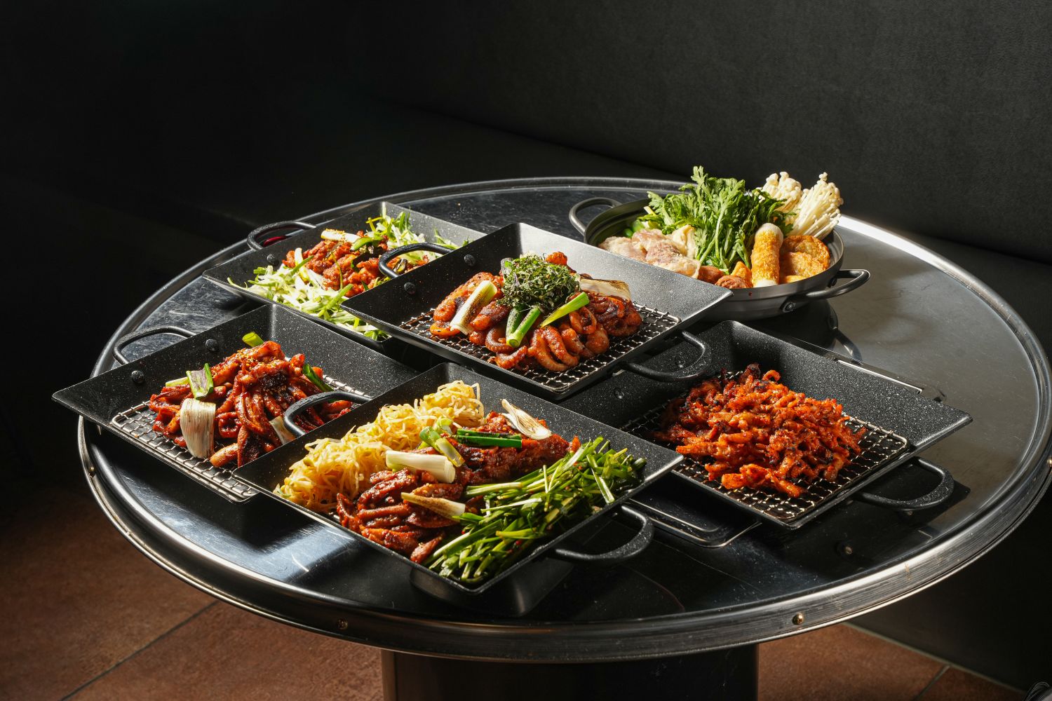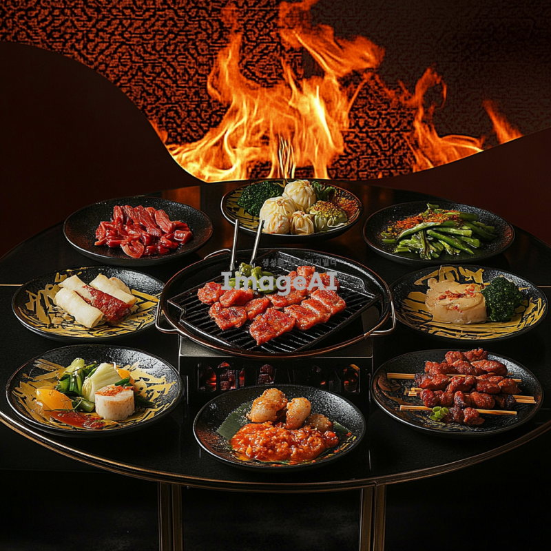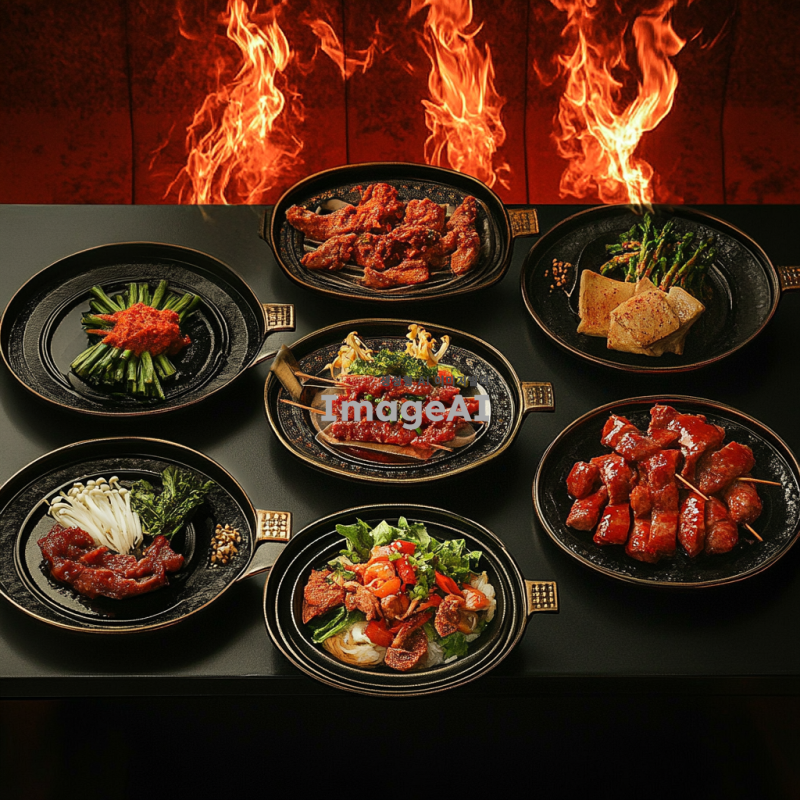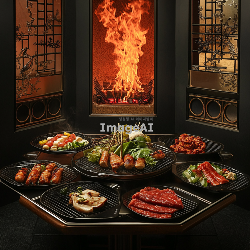 직화 요리 전문점의 주방에서 불 맛을 강조한 요리들이 정갈하게 플레이팅된 모습. 강렬한 빨간색의 불꽃이 요리 위로 올라오고, 다양한 직화 요리가 테이블에 놓여져 있어요. 고기와 채소가 잘 구워져 윤기가 흐르고, 신선한 재료들이 조화롭게 배치되어 있어요. 배경은 따뜻한 조명으로 아늑한 분위기를 연출하며, 한국 전통적인 요소가 가미된 인테리어가 보입니다. 전체적으로 맛있고 풍미 가득한 느낌을 주는 이미지.