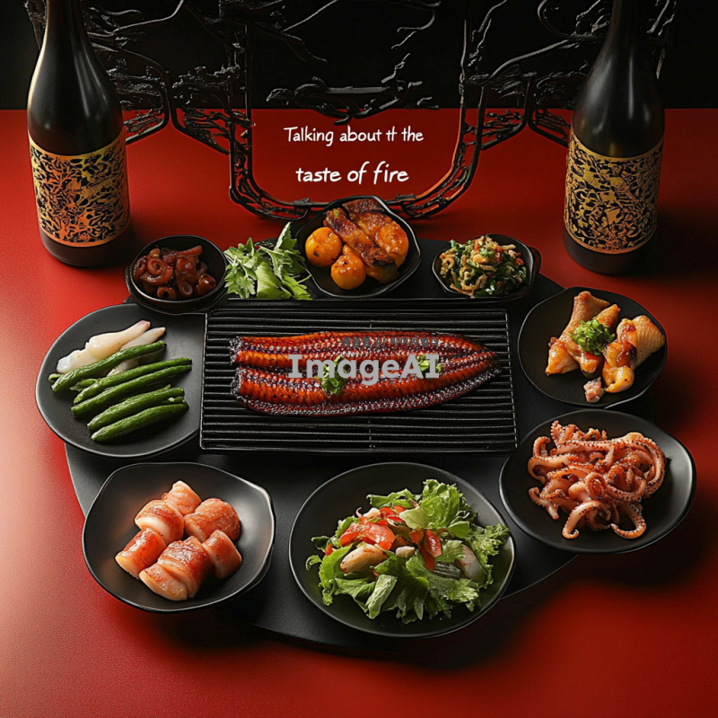 강렬한 빨간색 배경 위에 신선한 직화꼼장어, 직화오징어, 직화쭈꾸미, 직화닭목살이 정갈하게 플레이팅된 모습. 각 재료는 불에 구워져 윤기 나는 육즙과 함께 탱글탱글한 식감이 강조되며, 불맛이 느껴지는 연기가 살짝 올라오는 장면. 직화 요리의 깊은 풍미를 강조하는 소스가 곁들여져 있고, 주변에는 신선한 채소와 함께 조화를 이루는 모습. "불 맛을 이야기하다"라는 슬로건이 세련된 글씨체로 배치되어, 직화설의 철학과 가치를 잘 전달하는 이미지.