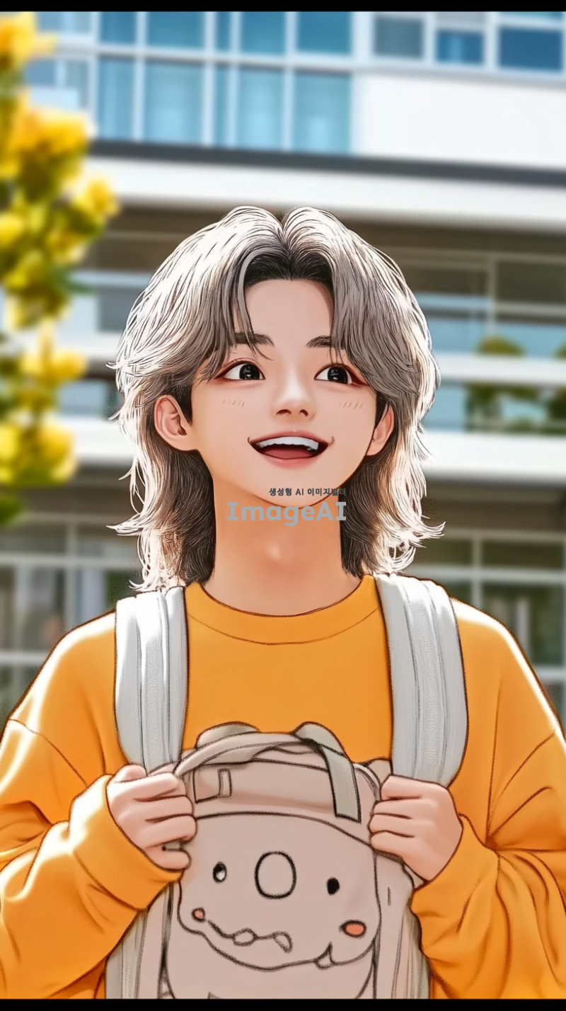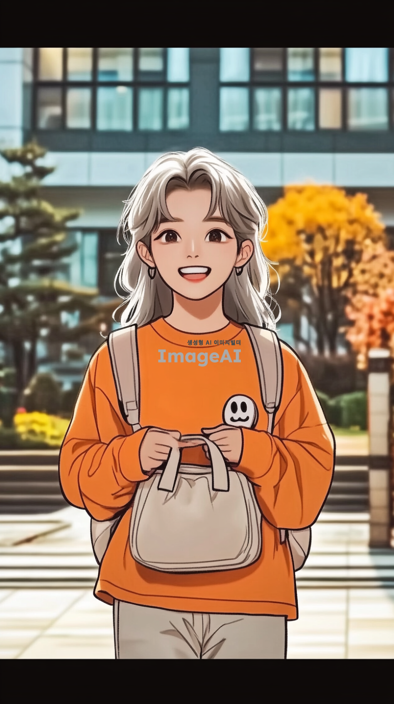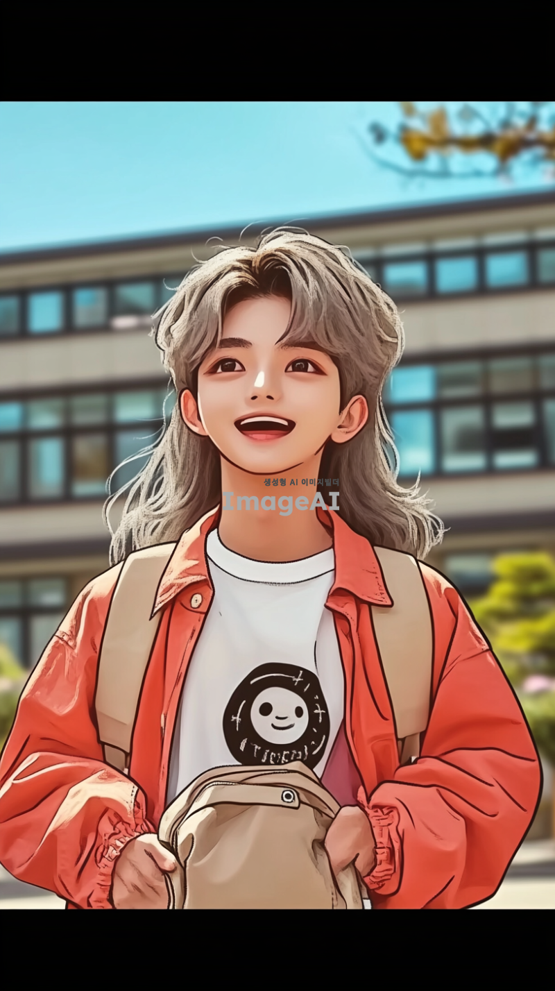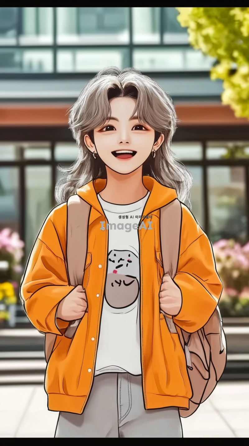 귀엽고 세련된 스타일의 한국 남학생이 고등학교에 등교하는 모습. 밝은 색상의 캐주얼한 옷을 입고, 가벼운 가방을 메고 있으며, 미소를 지으며 학교로 향하는 모습. 배경에는 현대적인 고등학교 건물이 보이고, 주변에는 나무와 꽃이 있는 정원 풍경. 전체적으로 따뜻하고 긍정적인 분위기를 연출.