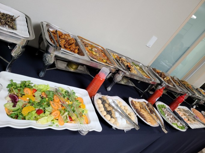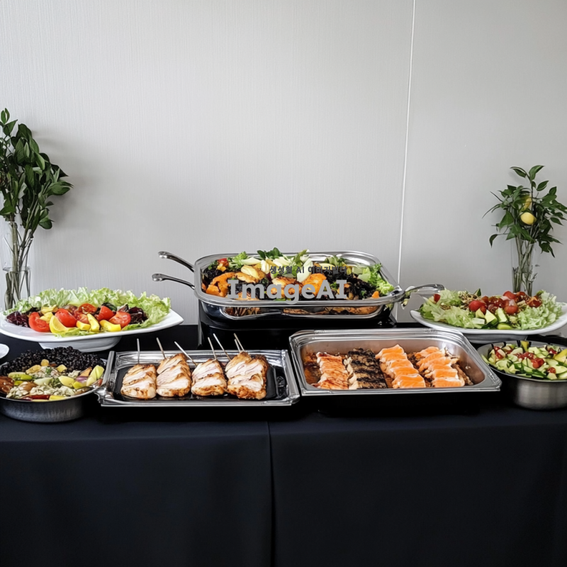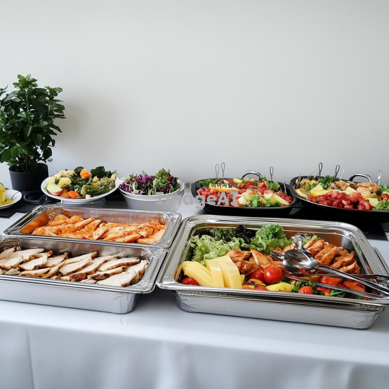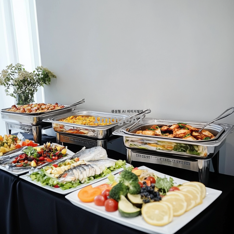 전문적인 사진으로, 정갈하게 배열된 플래터, 샐러드, 과일 테이블 세팅이 있는 사무실 미니 뷔페 테이블의 모습입니다. 주요 초점은 치킨 필레나 생선 같은 다양한 서양 요리로 가득 찬 두 개의 은색 체이핑 접시입니다. 배경은 연한 회색의 평범한 벽입니다.