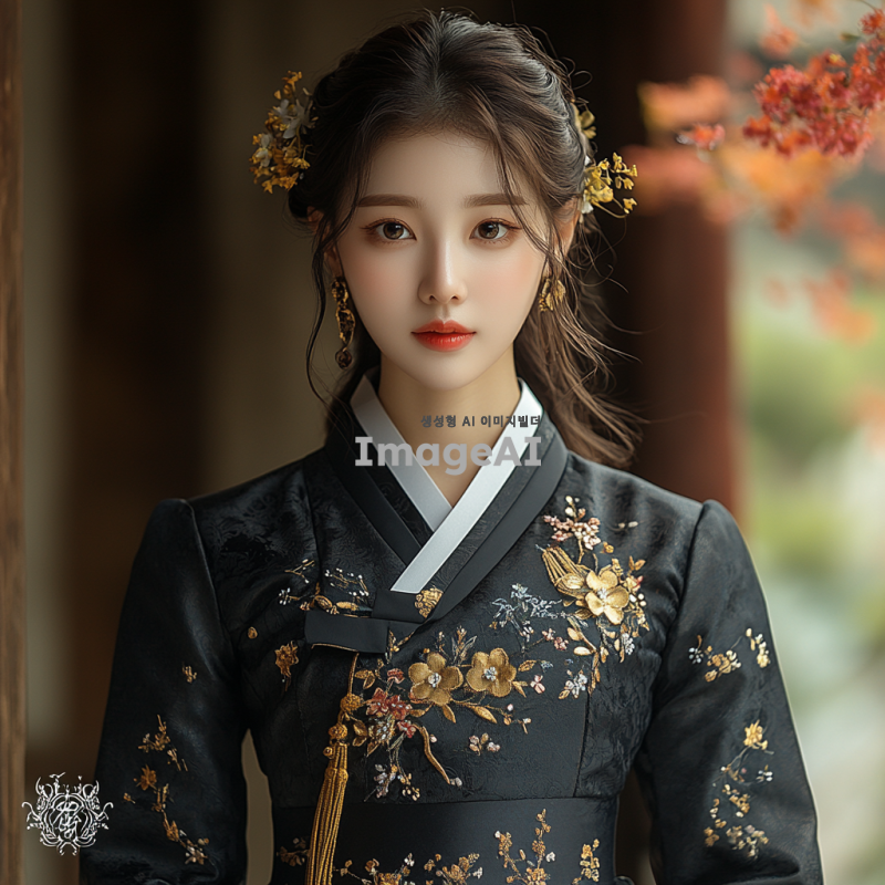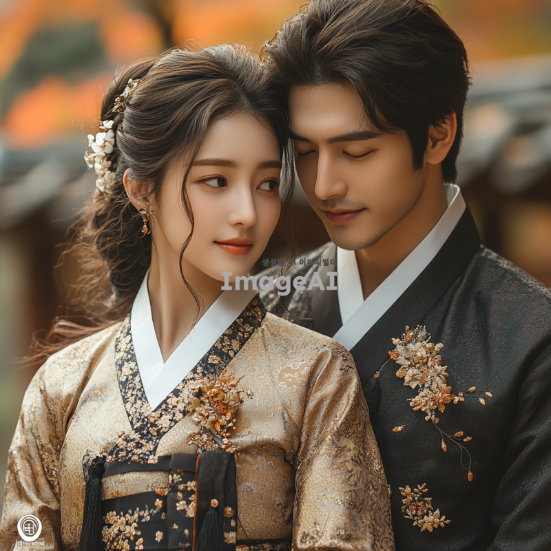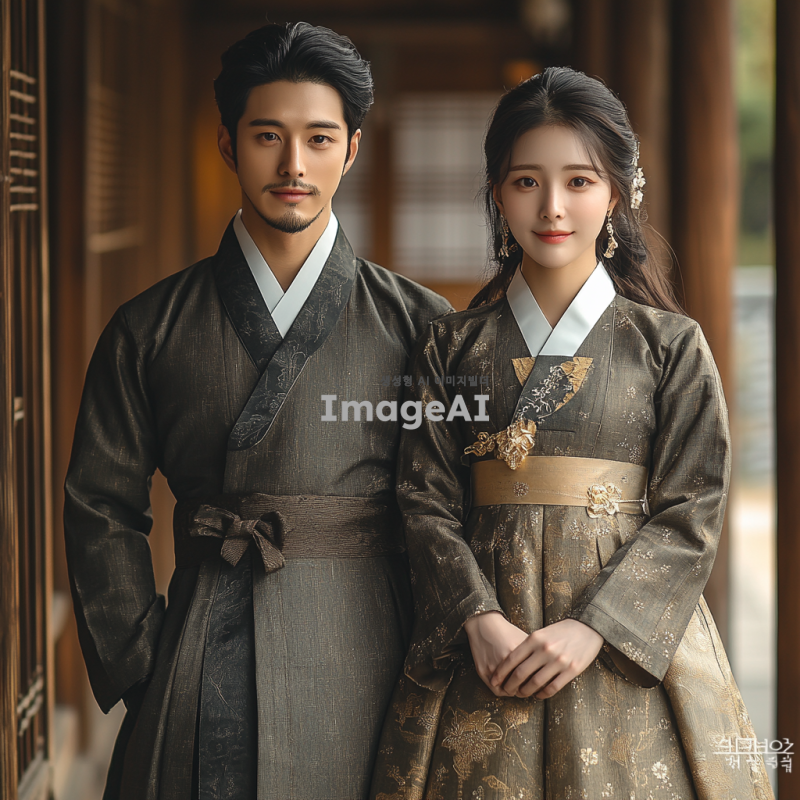 고급스러운 한복을 정장처럼 디자인한 모습, 세련된 색상과 현대적인 패턴을 사용하여 우아함과 품격을 강조한 스타일, 한국 전통의 아름다움과 현대적 감각이 조화롭게 어우러진 의상, 남성과 여성 모두 착용 가능한 디자인, 배경은 전통적인 한국의 건축물이나 자연 풍경으로 설정하여 한복의 아름다움을 더욱 돋보이게 함.