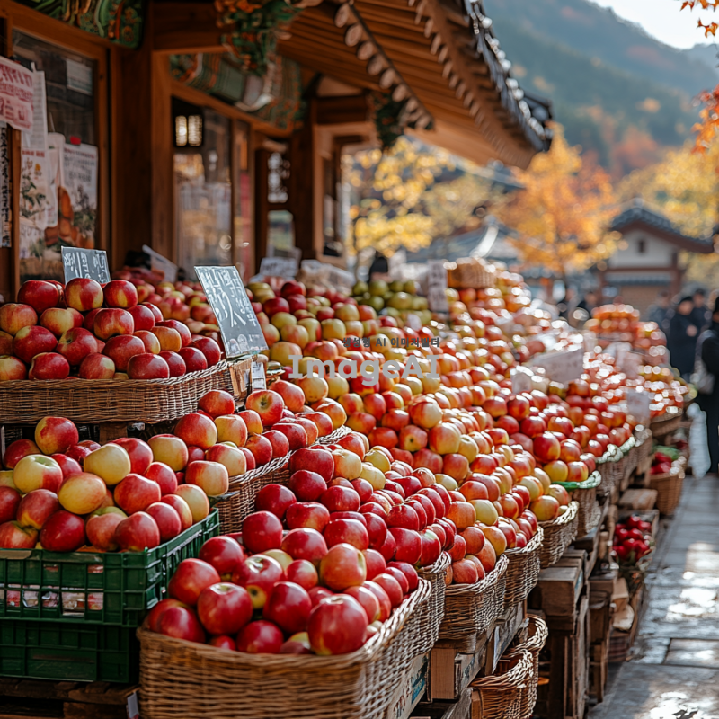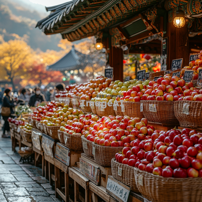 한국의 전통 시장에서 신선한 사과가 가득 쌓여 있는 모습. 다양한 색깔과 크기의 사과들이 햇빛에 반짝이며, 주변에는 바구니와 함께 진열된 모습. 시장의 활기찬 분위기와 사람들의 모습이 어우러진 장면. 배경에는 한국의 전통 건축물이 보이고, 따뜻한 가을 날씨를 느낄 수 있는 풍경.