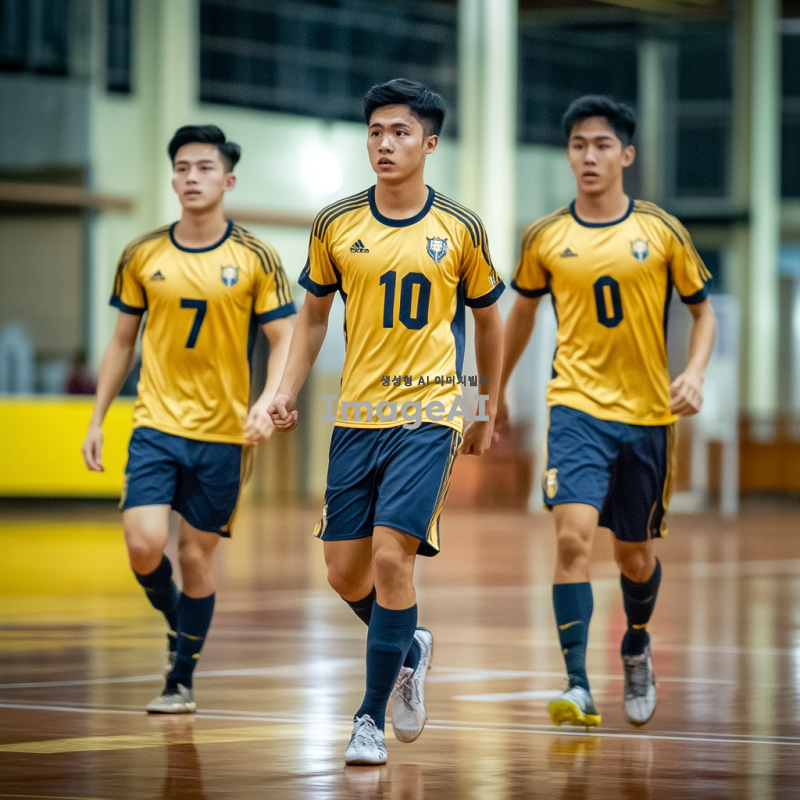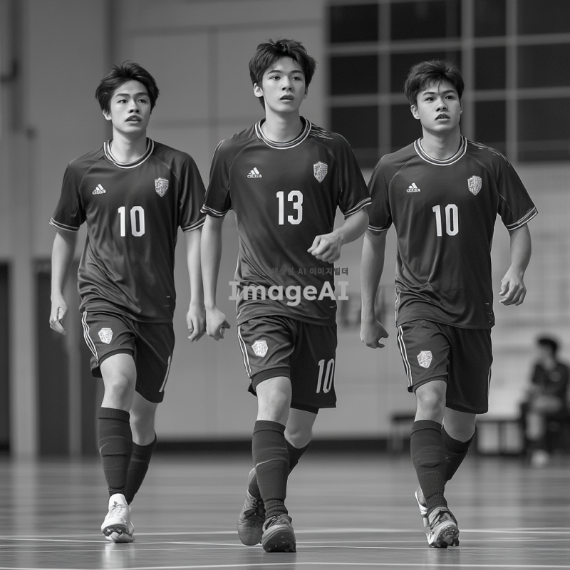 풋살장으로 들어가는 3명의 풋살 선수의 모습. 리더인 DOSA는 13번 유니폼을 입고 있으며, JACK CO는 10번, Y는 7번 유니폼을 입고 있다. 각 선수의 유니폼 상의와 하의에는 이름과 등번호가 선명하게 표시되어 있다. 세 선수는 비장한 표정으로 풋살장에 들어가고 있으며, DOSA가 특히 돋보이도록 강조되어 있다. 배경에는 풋살장이 보이고, 선수들의 자세는 결의에 차 있으며 팀워크를 느낄 수 있는 장면.