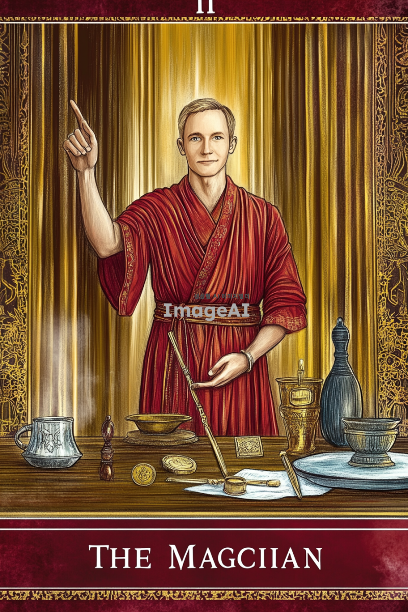 타로 카드 '마법사' 일러스트. 주인공은 20대 젊은 남성으로 차분하고 지혜로운 표정을 짓고 있다. 붉은색과 금색이 조화를 이루는 불교적인 분위기의 의복을 입고 있으며, 오른손은 하늘을 가리키고 왼손은 땅을 가리키고 있다. 이는 우주의 진리를 현실에 적용하는 의미를 표현한다. 앞에 놓인 탁자에는 네 가지 상징적 도구(컵, 검, 동전, 지팡이)가 있으며, 이는 4원소를 나타낸다. 배경에는 만다라나 연꽃 등 불교적인 문양이 은은하게 들어가 있어 영적인 느낌을 강조한다. 카드 상단에는 로마자 'I', 하단에는 'THE MAGICIAN'이라는 텍스트가 포함되어 있다. 전반적인 분위기는 신비롭고 고요한 느낌이다.