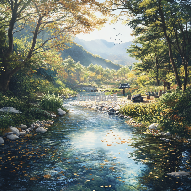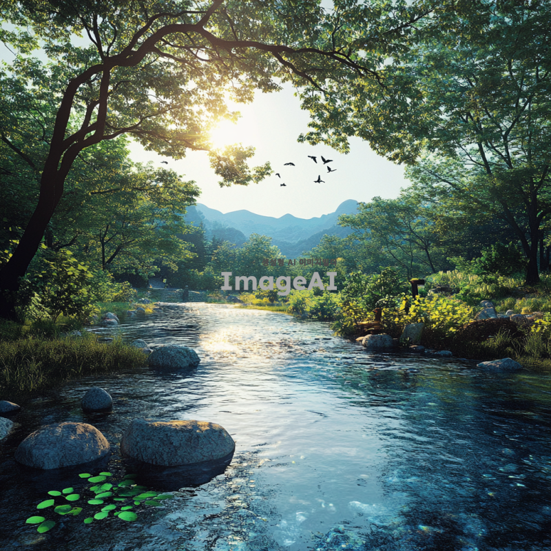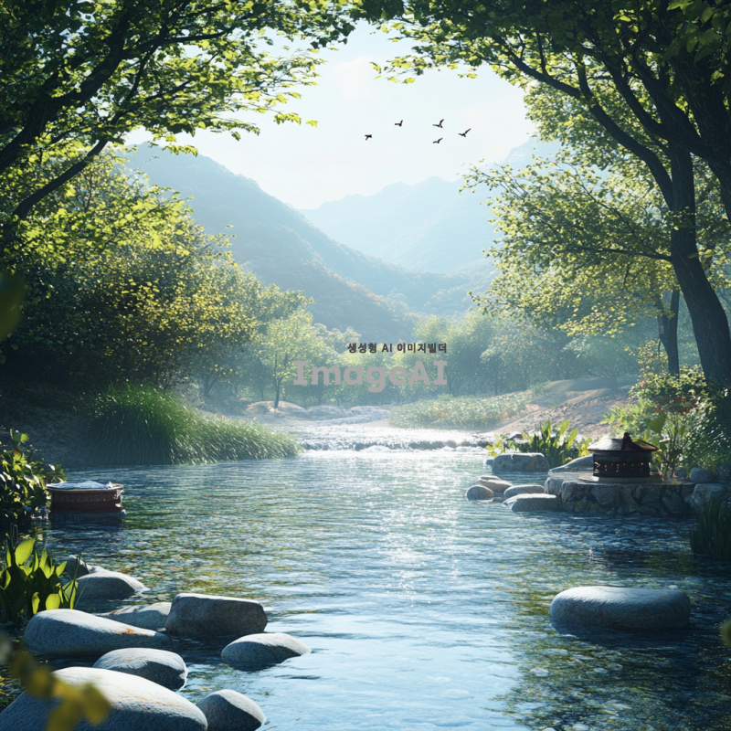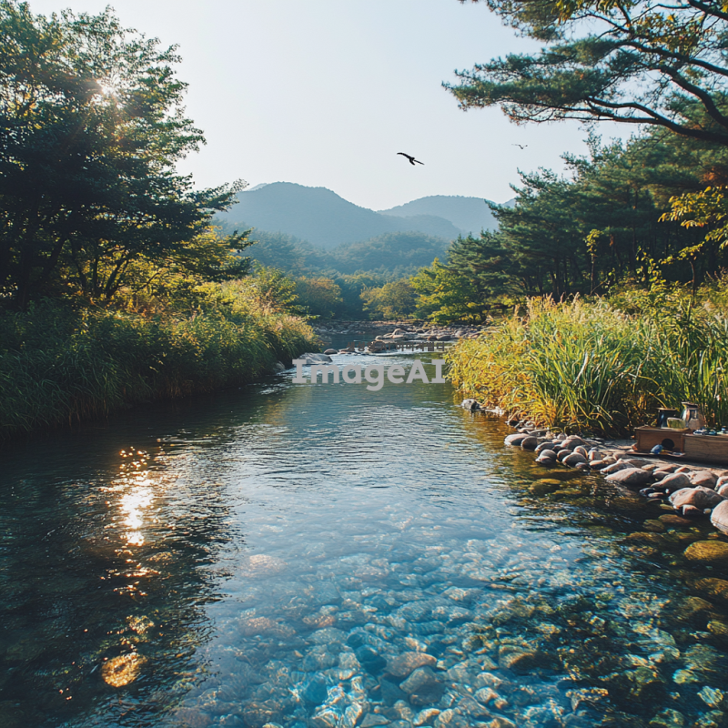 숲속의 한가운데에 위치한 맑고 푸른 강이 흐르고 있는 풍경. 햇살이 나뭇잎 사이로 비추어 따뜻한 느낌을 주며, 주변에는 다양한 식물과 나무들이 조화를 이루고 있다. 강가에는 작은 돌들이 놓여 있고, 물가에는 한국의 전통적인 소품이 놓여져 있으며, 자연의 평화로운 분위기가 강조된다. 배경에는 멀리 산이 보이고, 새들이 하늘을 날아다니는 모습이 그려진다.