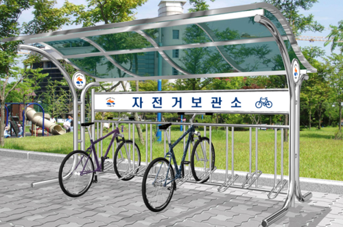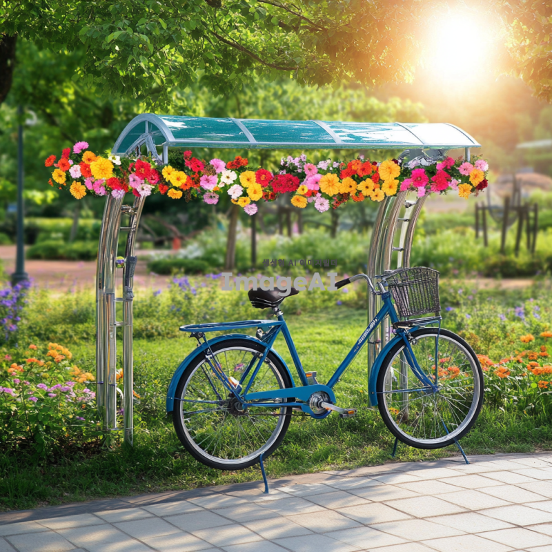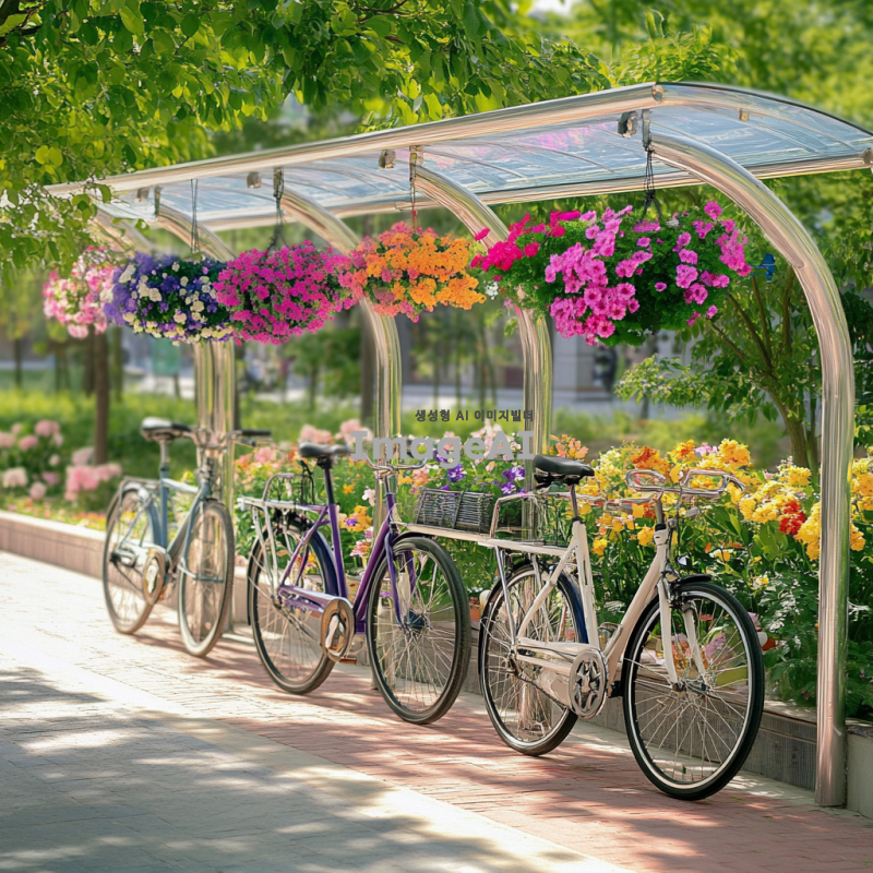 꽃과 어울려 있는 자전거 보관대, 다양한 색상의 꽃들로 장식된 자전거 보관대, 자연과 조화를 이루는 디자인, 햇살 아래에서 빛나는 자전거와 화사한 꽃들이 어우러진 풍경, 생동감 넘치는 정원 배경, 부드러운 색감과 따뜻한 분위기.