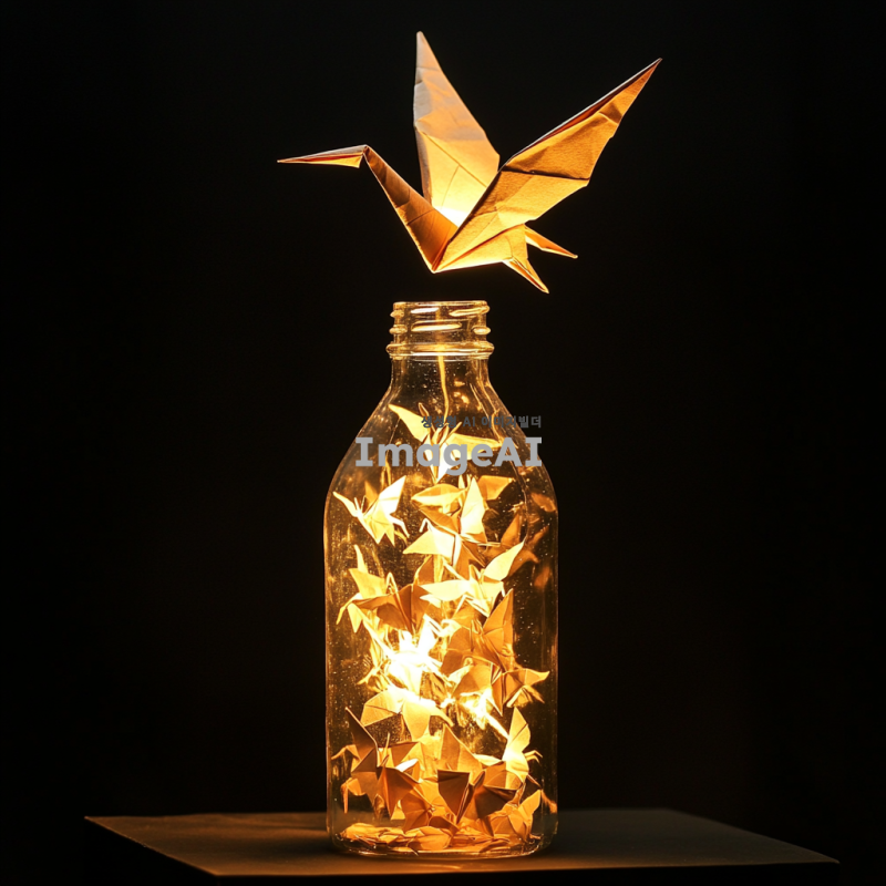 검정 배경에 약간의 오로라빛이 감도는 장면. 작은 병 안에는 여러 개의 종이학이 가득 차 있고, 그 중 한 마리의 큰 황금 종이학이 병 밖으로 나와 있으며, 밝은 빛이 그 황금 학을 비추고 있는 모습.