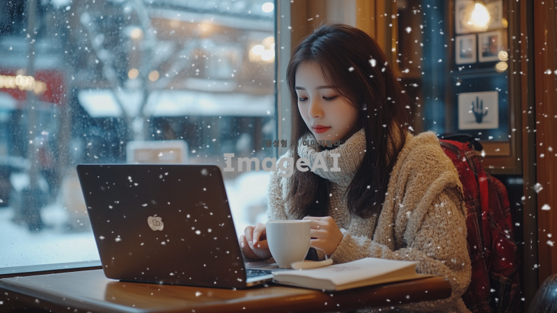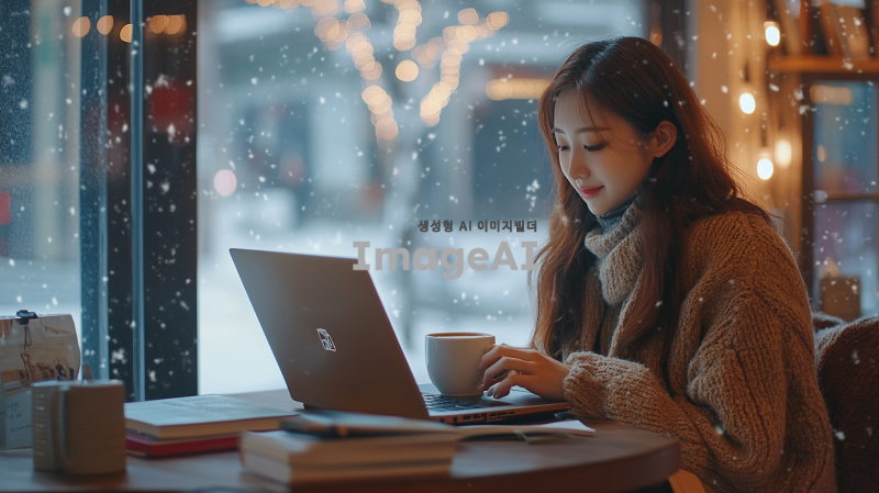 겨울 카페의 아늑한 분위기 속에서 여유롭게 커피를 마시며 노트북으로 작업하고 있는 20대 한국인 여성 인플루언서. 따뜻한 조명이 비추는 카페 내부, 창밖에는 눈이 softly 내리고 있으며, 그녀는 스타일리시한 겨울 패션을 입고 있다. 테이블 위에는 커피 잔과 노트북, 그리고 몇 권의 책이 놓여 있다.