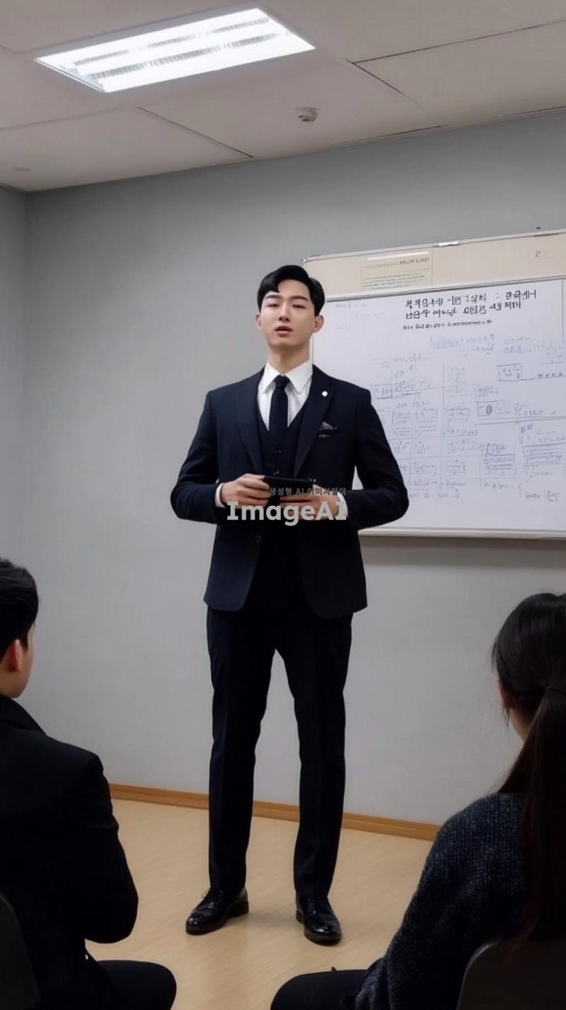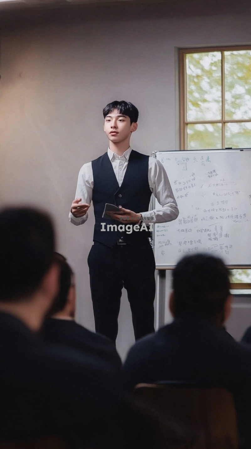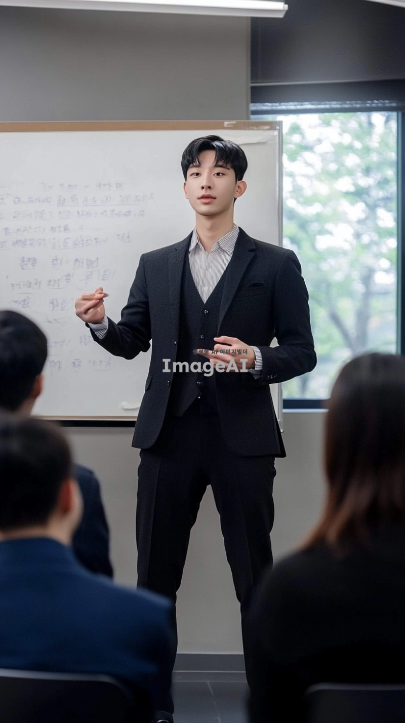 강의 중인 한국인 강사, 현대적인 강의실 배경, 학생들이 집중해서 듣고 있는 모습, 다양한 인종의 학생들, 화이트보드에 설명이 적혀 있는 장면, 자연광이 들어오는 창문, 전문적인 분위기, 교육적인 느낌 강조