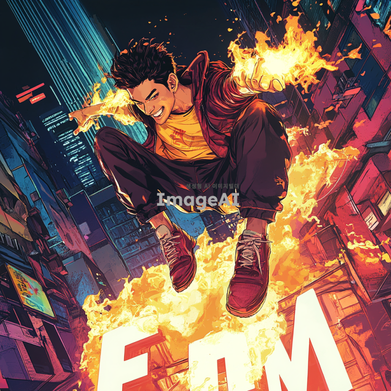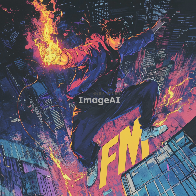 FM 글씨가 적힌 빌딩 위에서 뛰어내리는 한국인 개구쟁이, 주먹에서 불꽃이 타오르며 역동적인 포즈를 취하고 있는 모습, 도시의 배경과 함께 생동감 넘치는 색감으로 표현된 이미지.
