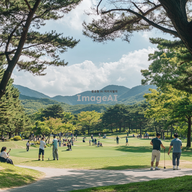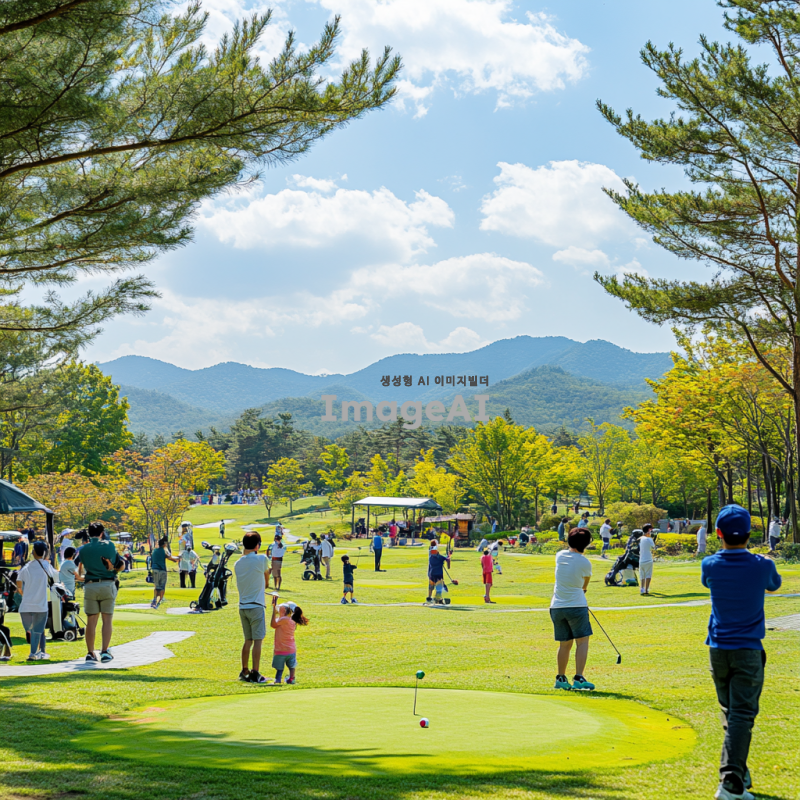 한국의 아름다운 공원에서 파크골프를 즐기는 사람들, 푸른 잔디밭과 나무들로 둘러싸인 경치, 햇살이 비치는 따뜻한 날씨, 다양한 연령대의 사람들이 활짝 웃으며 골프채를 휘두르는 모습, 즐거운 분위기와 함께하는 가족 및 친구들, 배경에는 멀리 산과 구름이 보이는 풍경.