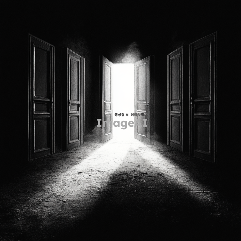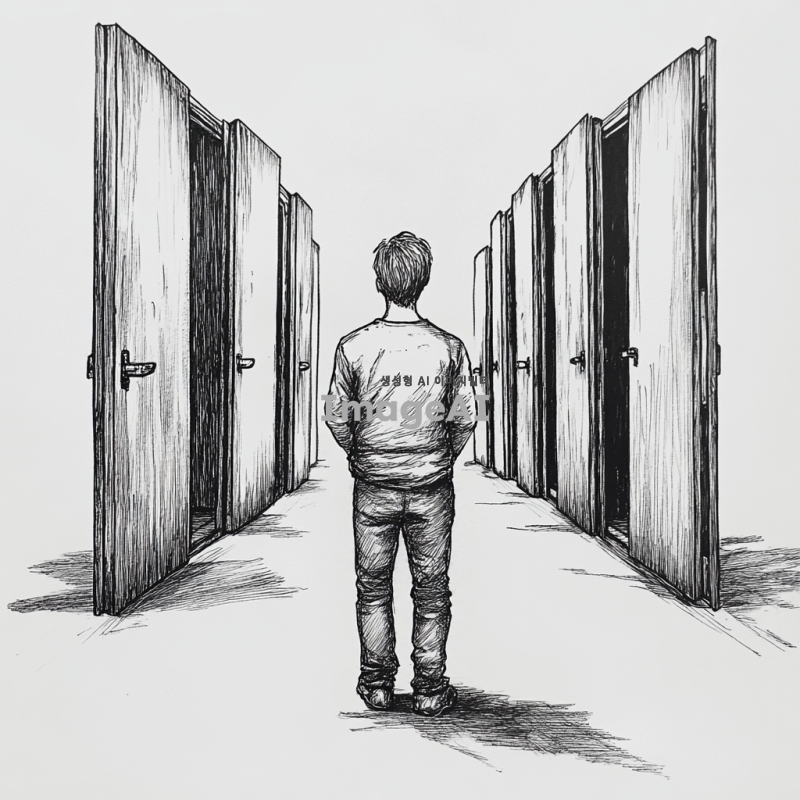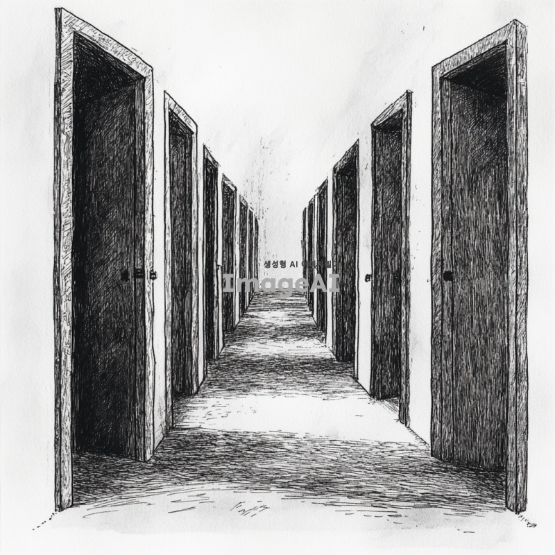 내 앞에 수많은 문이 있어. 나는 열쇠야. 어느 문이 열릴지 모르기 때문에 하나씩 열어보고 안되면 재빠르게 다른 문을 열꺼야. 이 상황을 그려줘