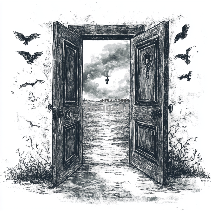 내 앞에는 수 많은 문이 있어. 나는 열쇠야. 어느 문이 열릴지 모르기 때문에 하나씩 열어보고 안 열리면 재빠르게 다른 문을 열꺼야. 이 상황을 그려줘