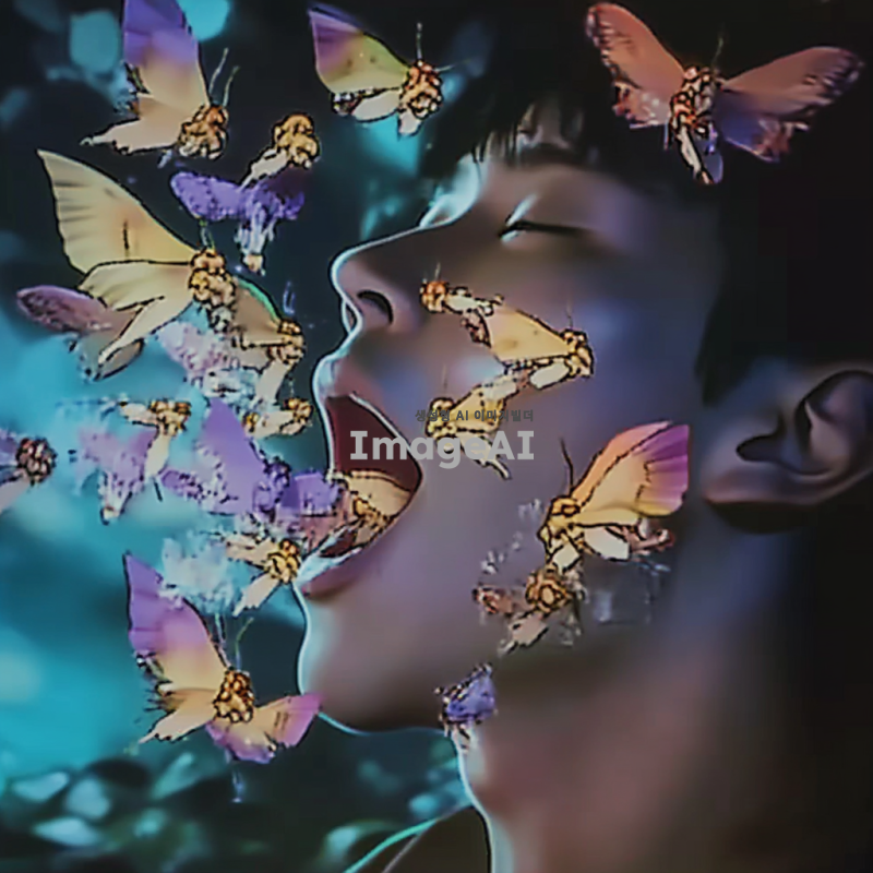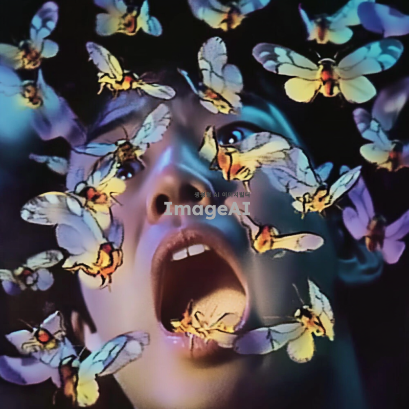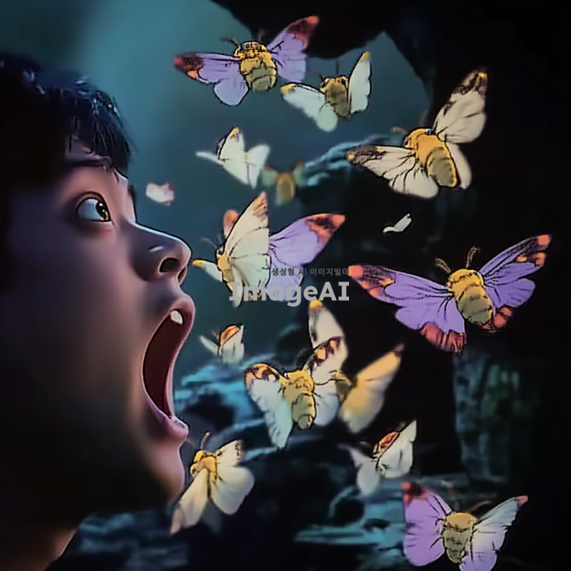 입에서 나방이 나오는 장면을 그린 이미지, 한국인 남성이 놀란 표정을 짓고 있는 모습, 어두운 배경에 신비로운 조명 효과, 나방은 다양한 색상과 패턴을 가진 생동감 있는 모습, 입에서 나오는 나방들이 공중에서 날아오르는 모습, 초현실적이고 몽환적인 분위기.