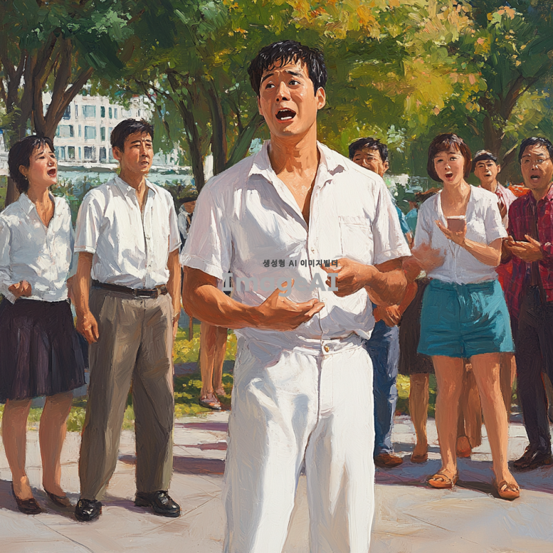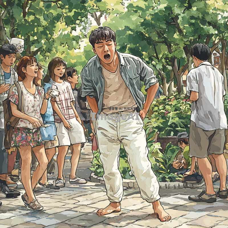 한 남자가 바지에 오줌을 싼 상황을 겪고 있는 모습, 당황한 표정과 함께 주변 사람들의 놀란 반응이 담긴 장면, 도심의 공원 배경, 자연스러운 색감과 생동감 있는 분위기, 한국인 남성, 캐주얼한 흰색바지, 상황의 유머러스한 요소를 강조.