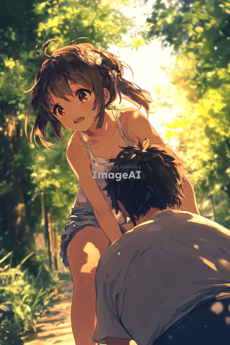 귀여운 여자아이가 자신의 왼쪽 다리로 남자의 등을 밟고 있는 장면. 남자는 힘들어 보이며, 표정에는 애처로움이 묻어나고 있다. 배경은 공원으로, 따뜻한 햇살 아래에서 아이가 즐거워하는 모습과 남자의 고생하는 모습이 대조적으로 나타나도록 구성. 여자아이는 귀엽고 발랄한 스타일로, 남자는 약간 지친 듯한 모습으로 그려져 있다.