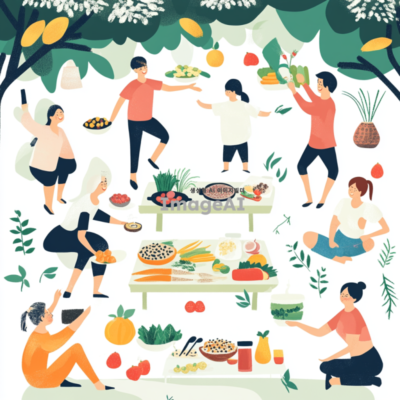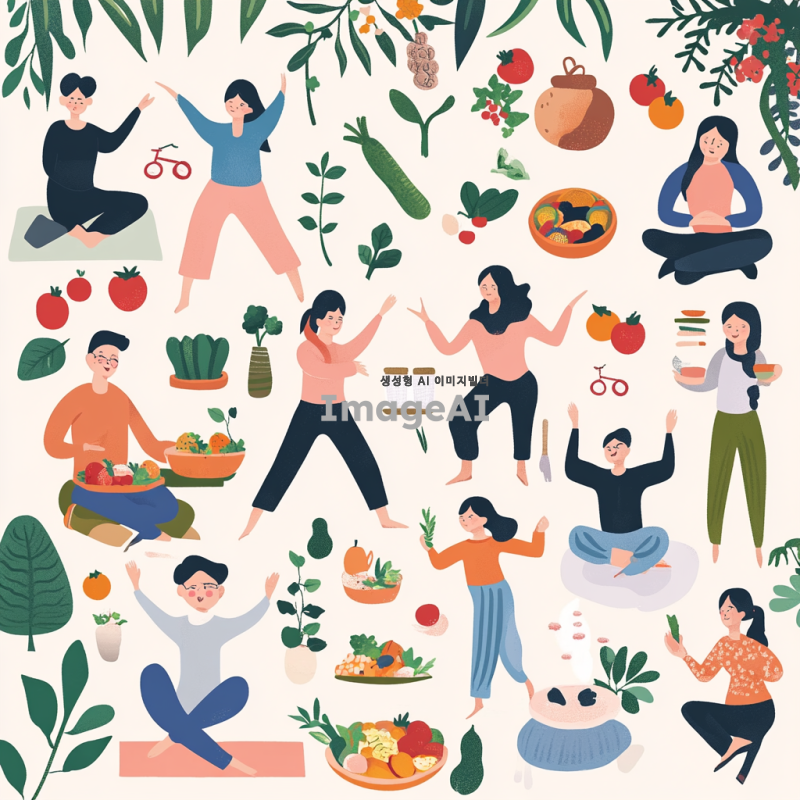 건강의 개념을 시각적으로 표현한 이미지. 다양한 연령대의 한국인들이 함께 운동하고, 건강한 음식을 나누며, 웃고 있는 모습. 자연 속에서 즐거운 시간을 보내는 모습, 신선한 과일과 채소가 가득한 식탁, 요가를 하는 사람들, 그리고 긍정적인 에너지를 느끼는 표정들. 건강한 삶의 여러 측면을 포괄적으로 나타내는 따뜻하고 활기찬 분위기.