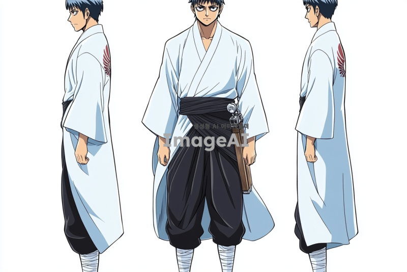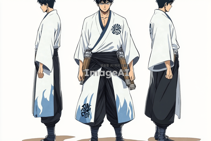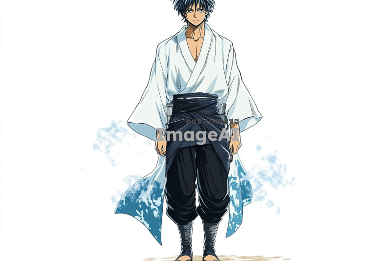 진격의 거인 캐릭터, 흰색과 파란색 로브에 검은 바지를 입고 있는 캐릭터 디자인, 전신 샷, 애니메이션 스타일, 간단한 배경, 그림자 없음, 이미지에 텍스트나 글자가 없음. 목업 없이 명확한 윤곽과 머리카락, 뚜렷한 선으로 그려진 흰색 배경.