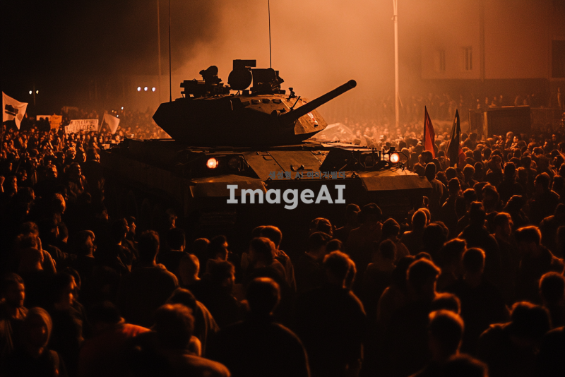 밤에 촬영된 이미지로, 탱크 또는 장갑차와 같은 장갑 군용 차량이 큰 인파에 둘러싸여 있는 장면. 사람들은 시위나 집회와 관련된 상황에 참여하고 있으며, 긴장감이 감도는 분위기를 표현. 주변은 어두운 조명 아래에서 사람들의 표정과 차량의 강렬한 모습이 강조되어 있다.
