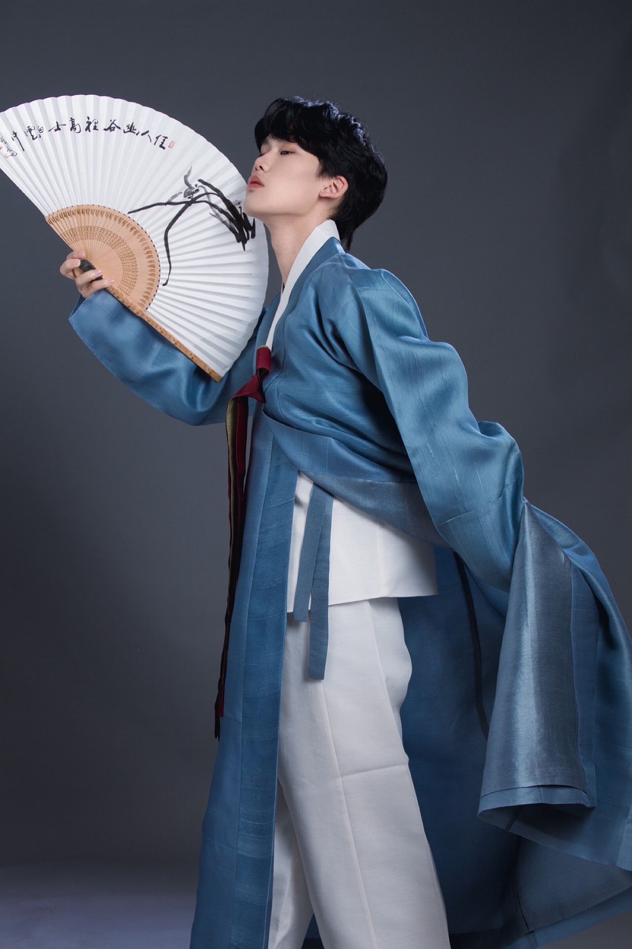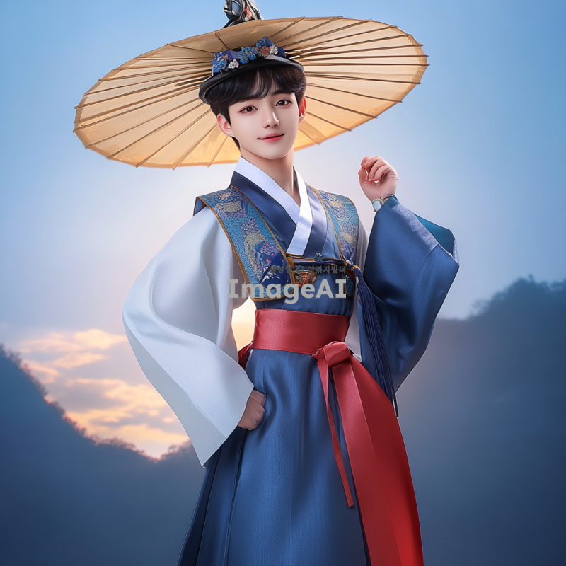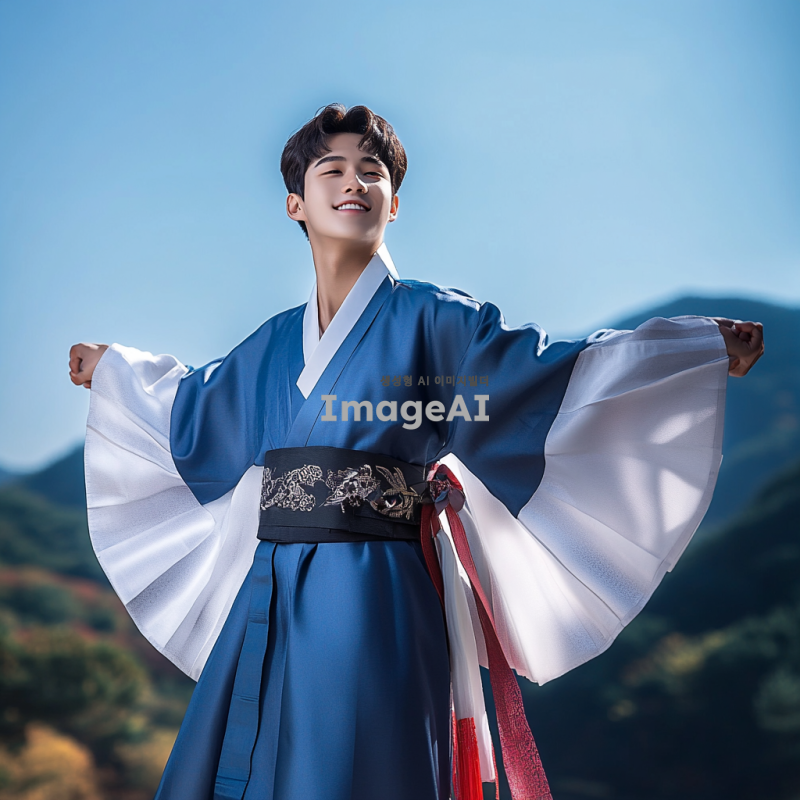 한국의 전통 의상을 입은 젊은 남성 캐릭터, 밝은 미소와 함께 자신감 넘치는 포즈, 배경은 아름다운 한국의 자연 풍경, 푸른 하늘과 산, 따뜻한 햇살이 비치는 모습, 세련된 헤어스타일과 현대적인 액세서리, 친근하고 매력적인 분위기, 생동감 넘치는 색감.