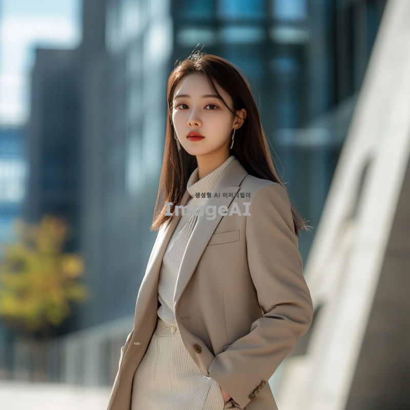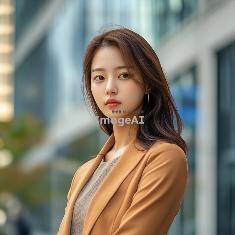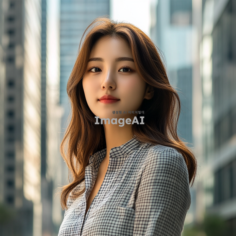 현대적인 도시 배경에서 자신감 넘치는 표정으로 서 있는 젊은 한국 여성의 모습, 세련된 패션 스타일과 자연스러운 헤어스타일, 전문적인 분위기를 강조하는 포즈, 밝고 선명한 색감, 현대적인 건축물과 함께 조화를 이루는 배경.