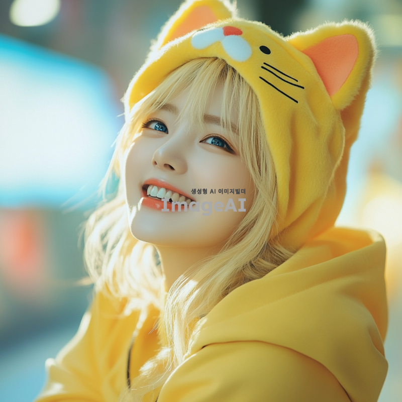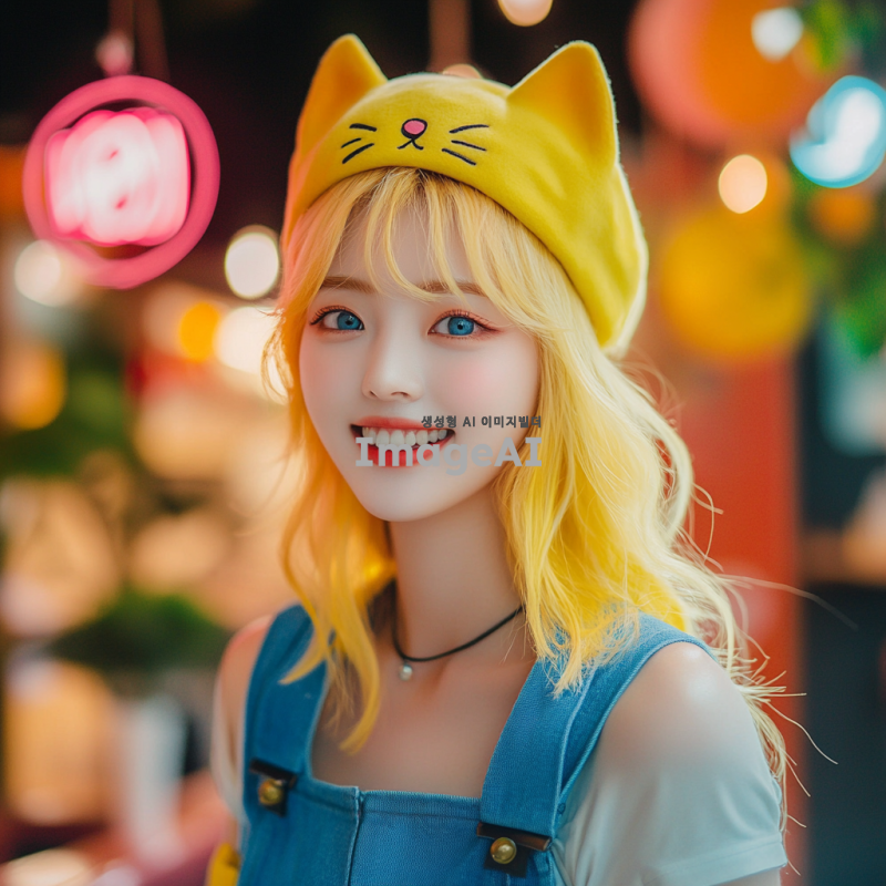 고양이 모자를 쓴 한국인 여성, 노란 머리와 파란 눈을 가진 아이돌 같은 느낌의 이미지. 밝고 화사한 배경, 귀여운 포즈로 미소 짓고 있는 모습. 스타일리시한 의상과 함께 고양이 모자의 디테일이 잘 보이도록.