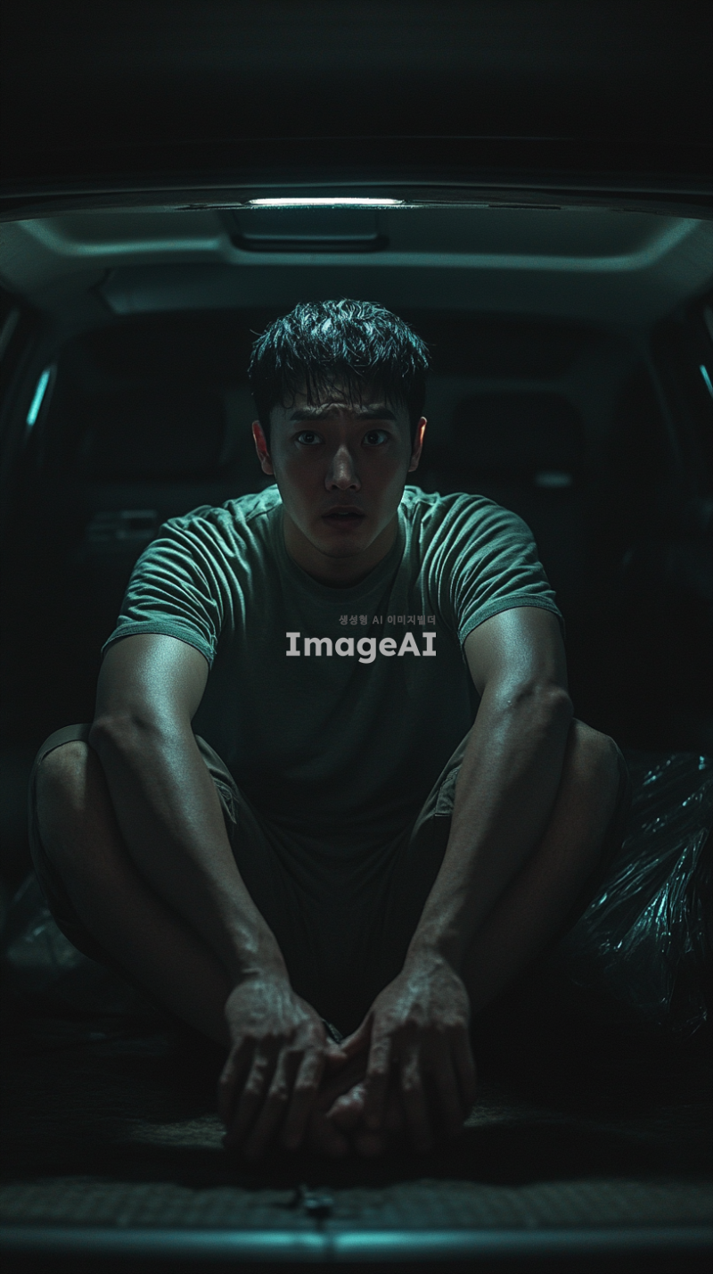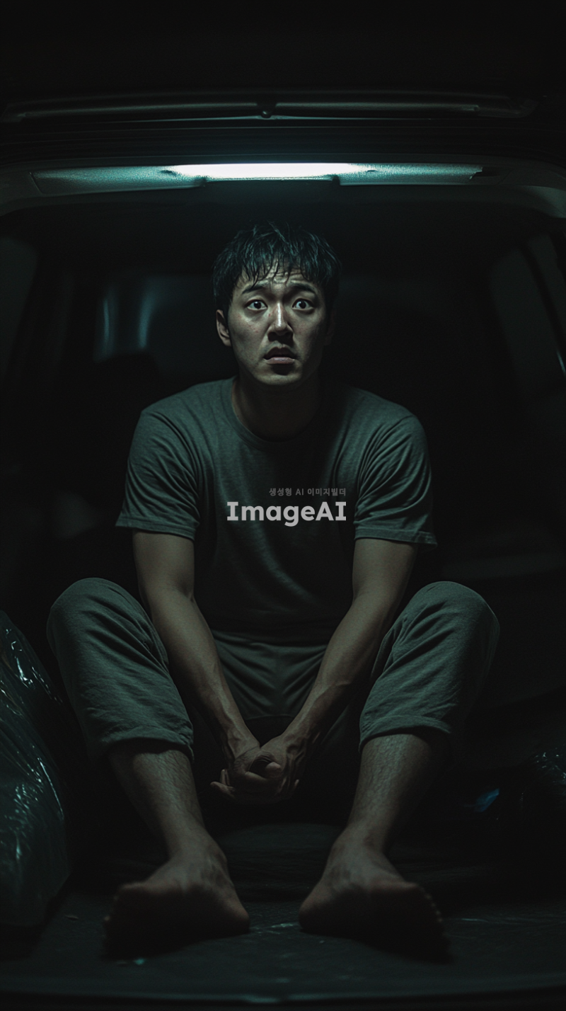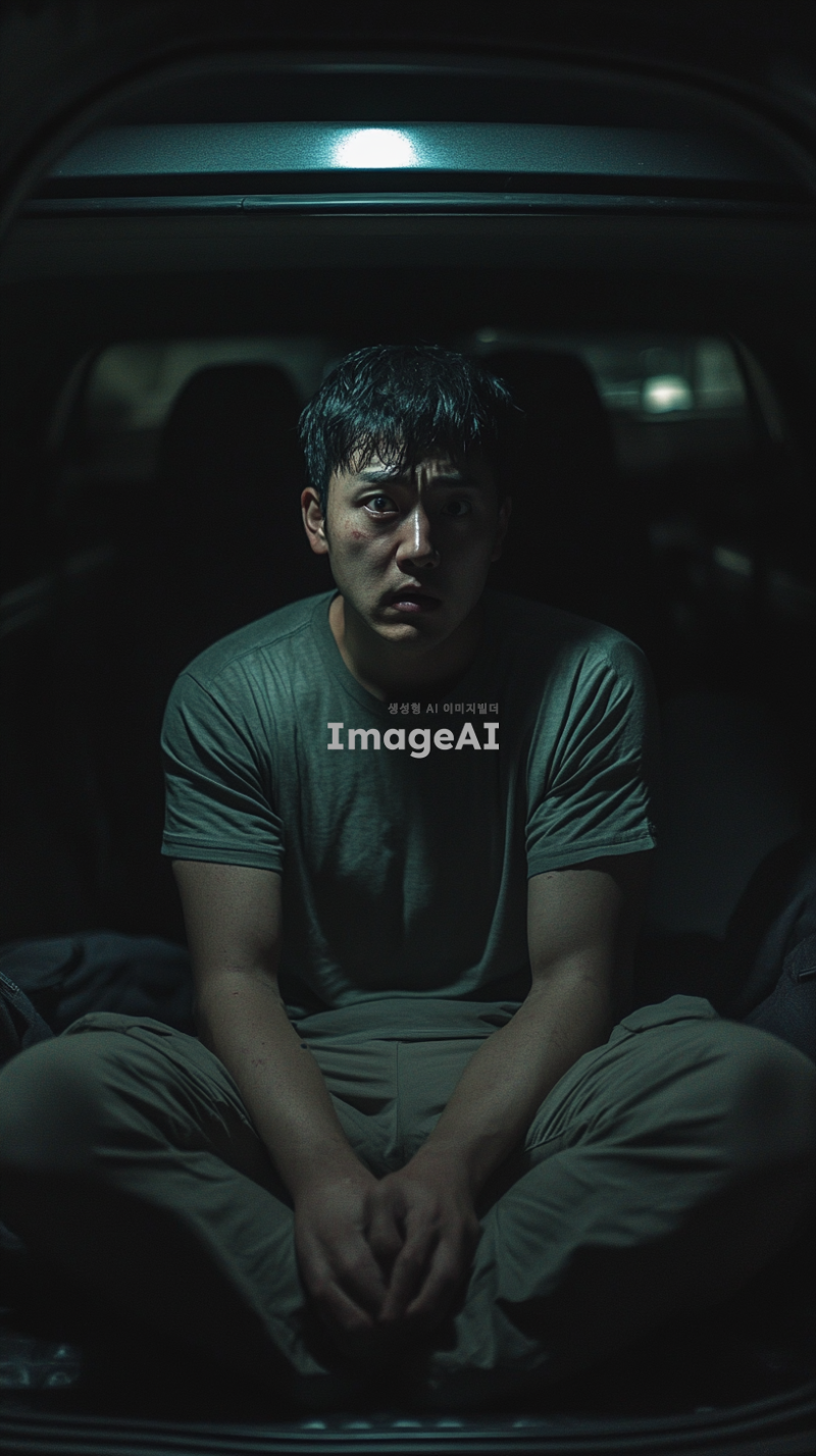 어두운 밤, 승용차 트렁크 안에 갇힌 한국인 남성이 혼자 앉아 있다. 그의 표정은 두려움과 불안으로 가득 차 있으며, 주변은 어둡고 음산한 분위기이다. 트렁크의 내부는 좁고 폐쇄된 공간으로, 희미한 빛이 들어오고 있다. 남성은 두 손으로 무릎을 감싸고 있으며, 눈은 크게 뜨고 주위를 살피고 있다.