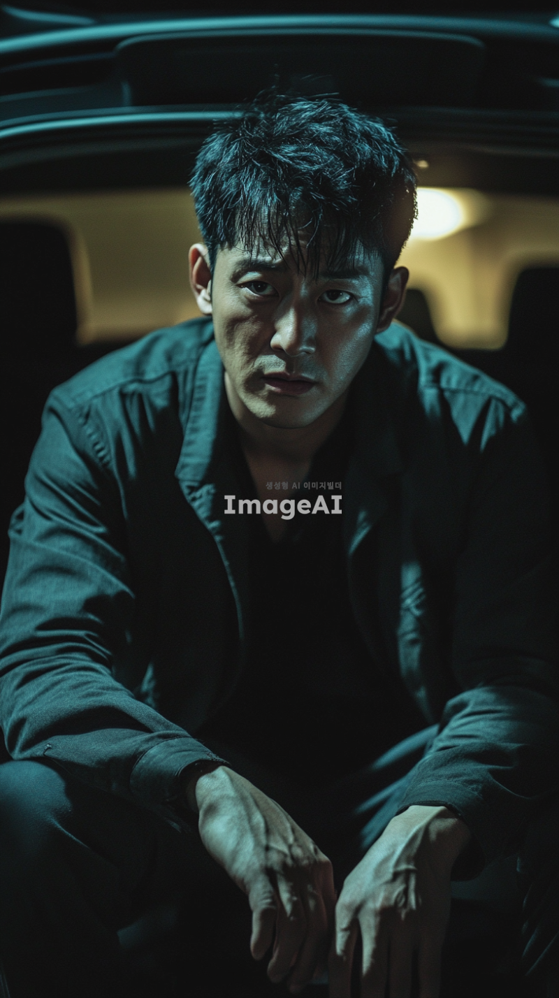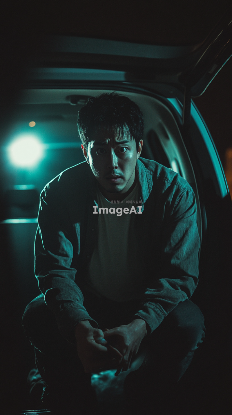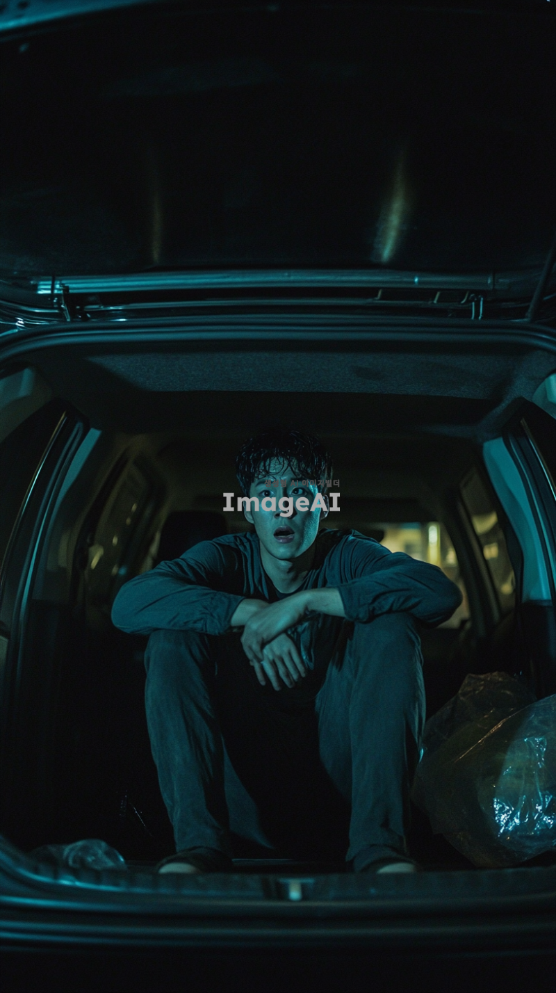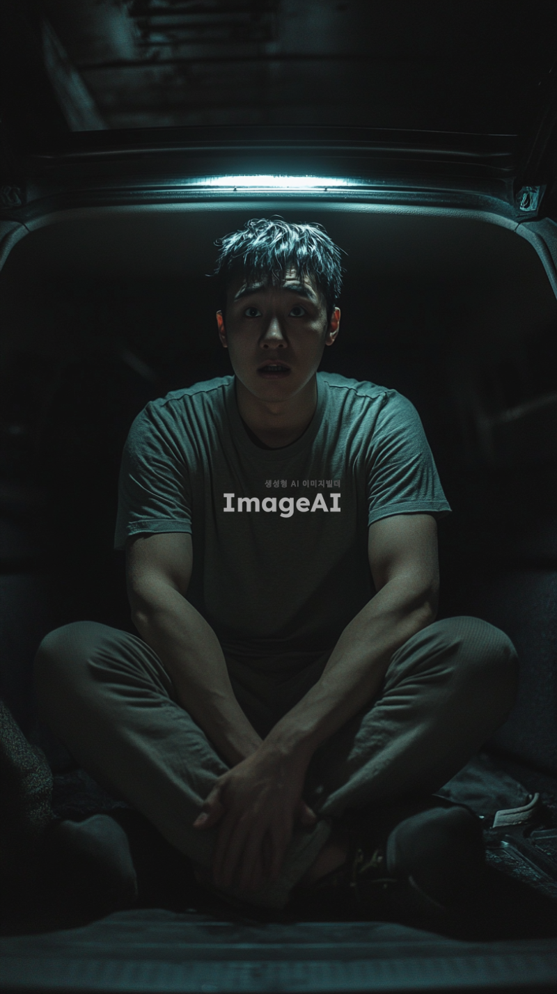 어두운 밤, 승용차 트렁크 안에 갇힌 한국인 남성이 혼자 앉아 있다. 그의 표정은 두려움과 불안으로 가득 차 있으며, 주변은 어둡고 음산한 분위기이다. 트렁크의 내부는 좁고 폐쇄된 공간으로, 희미한 빛이 들어오고 있다. 남성은 두 손으로 무릎을 감싸고 있으며, 눈은 크게 뜨고 주위를 살피고 있다.