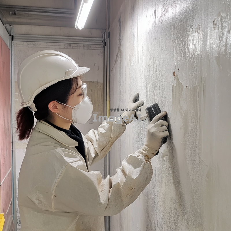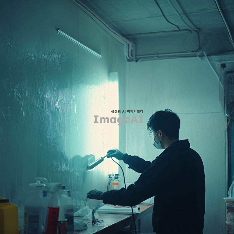 곰팡이가 제거되는 과정 중인 벽면, 밝은 조명 아래에서 전문적인 장비를 사용하여 곰팡이를 청소하는 한국인 기술자, 깨끗하고 정돈된 작업 공간, 벽면의 곰팡이가 사라지는 모습, 청결과 안전을 강조하는 분위기, 실제적인 작업 환경, 고해상도.