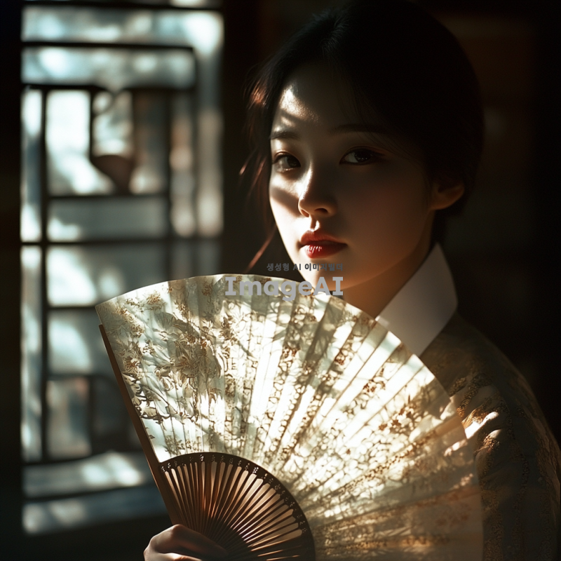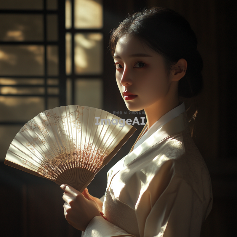 역광에서 부채를 들고 있는 한국인 여성의 모습을 그려주세요. 부채를 통해 비치는 배경의 물체들이 선명하게 드러나도록 해주세요. 부채는 섬세한 문양이 새겨져 있고, 여성은 전통 한복을 입고 있습니다. 부채의 그림자와 빛의 반사 효과가 강조되도록 하여, 전체적인 분위기가 신비롭고 우아하게 느껴지도록 만들어주세요.