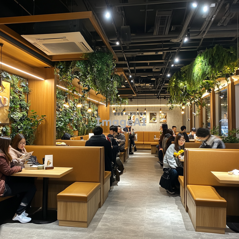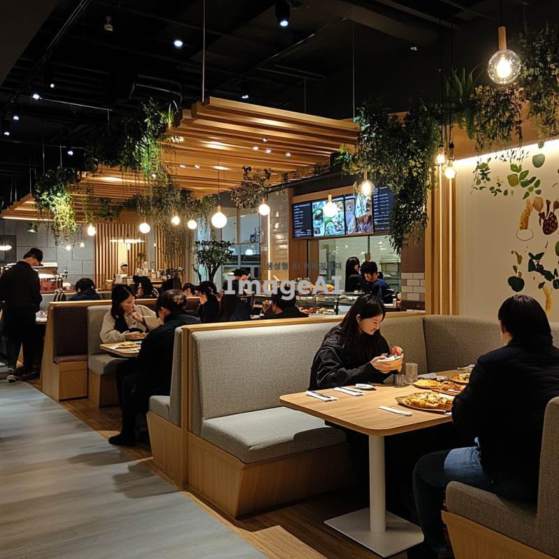 한국의 현대적인 구내식당 내부, 다양한 음식을 제공하는 부스와 테이블, 직원들이 친절하게 손님을 맞이하는 모습, 따뜻한 조명 아래에서 사람들이 식사하는 장면, 식사 후 대화하는 모습, 깨끗하고 아늑한 분위기, 벽에는 식물 장식과 현대적인 아트워크가 있는 공간.